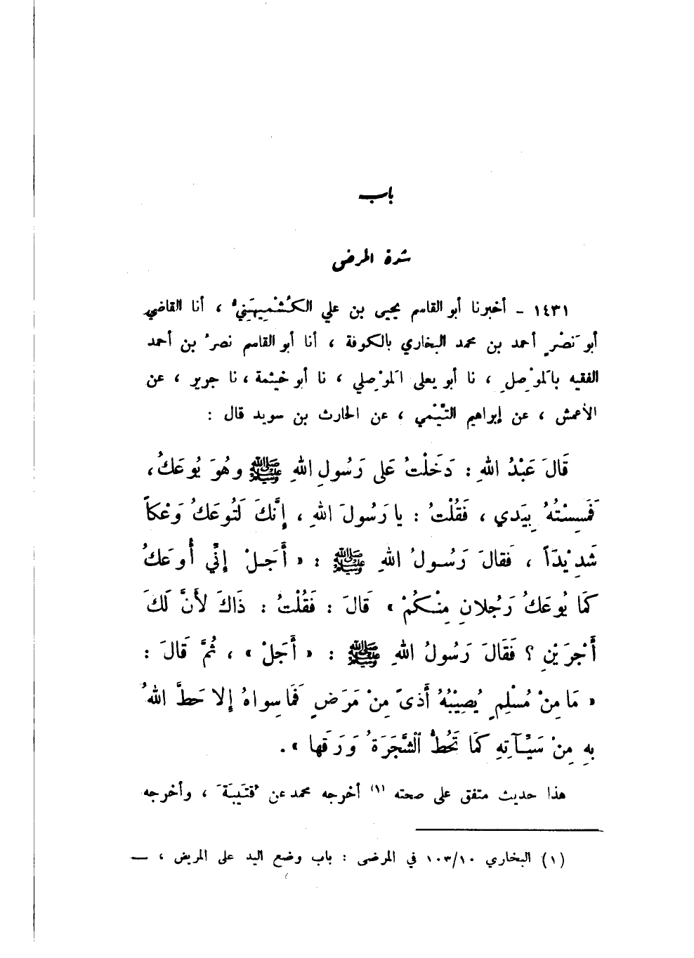 1431 - أَخْبَرَنَا أَبُو الْقَاسِمِ يَحْيَى بْنُ عَلِيٍّ الْكُشْمِيهَنِيُّ، أَنا الْقَاضِي أَبُو نَصْرٍ أَحْمَدُ بْنُ مُحَمَّدٍ الْبُخَارِيُّ بِالْكُوفَةِ، أَنا أَبُو الْقَاسِمِ نَصْرُ بْنُ أَحْمَدَ الْفَقِيهُ، بِالْمَوْصِلِ، نَا أَبُو يَعْلَى الْمَوْصِلِيُّ، نَا أَبُو خَيْثَمَةَ، نَا جَرِيرٌ، عَنِ الأَعْمَشِ، عَنْ إِبْرَاهِيمَ التَّيْمِيِّ، عَنِ الْحَارِثِ بْنِ سُوَيْدٍ، قَالَ: قَالَ عَبْدُ اللَّهِ: دَخَلْتُ عَلَى رَسُولِ اللَّهِ صَلَّى اللهُ عَلَيْهِ وَسَلَّمَ وَهُوَ يُوعَكُ، فَمَسِسْتُهُ بِيَدِي، فَقُلْتُ: يَا رَسُولَ اللَّهِ، إِنَّكَ لَتُوعَكُ وَعْكًا شَدِيدًا، فَقَالَ رَسُولُ اللَّهِ صَلَّى اللهُ عَلَيْهِ وَسَلَّمَ: «أَجَلْ إِنِّي أُوعَكُ كَمَا يُوعَكُ رَجُلانِ مِنْكُمْ»، قَالَ: فَقُلْتُ: ذَاكَ لأَنَّ لَكَ أَجْرَيْنِ؟ فَقَالَ رَسُولُ اللَّهِ صَلَّى اللهُ عَلَيْهِ وَسَلَّمَ: «أَجَلْ»، ثُمَّ قَالَ: «مَا مِنْ مُسْلِمٍ يُصِيبُهُ أَذًى مِنْ مَرَضٍ فَمَا سِوَاهُ إِلا حَطَّ اللَّهُ بِهِ مِنْ سَيِّئَاتِهِ كَمَا تَحُطُّ الشَّجَرَةُ وَرَقَهَا».