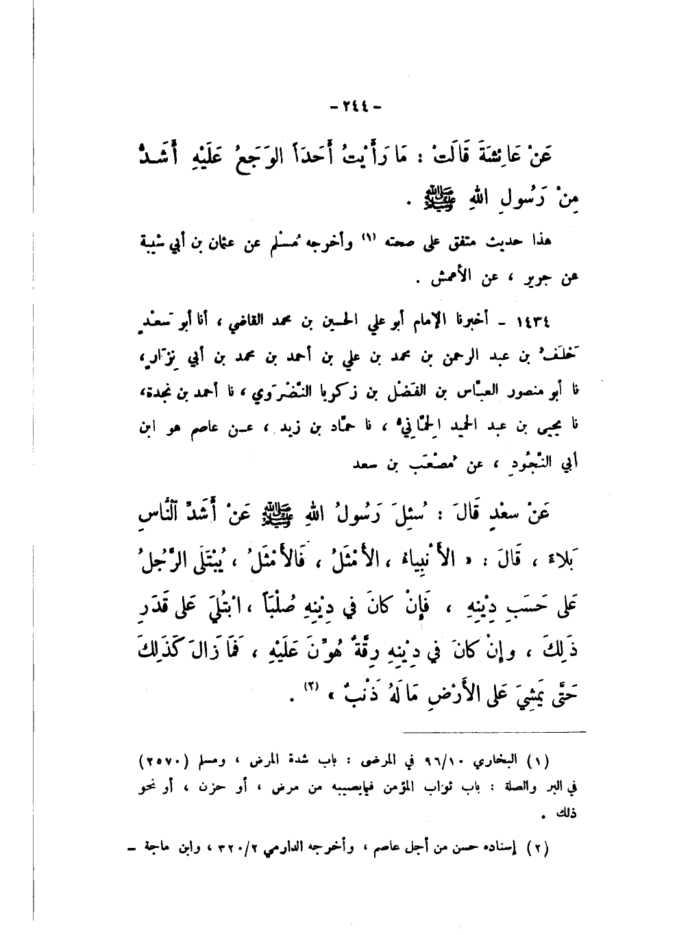 1434 - أَخْبَرَنَا الإِمَامُ أَبُو عَلِيٍّ الْحُسَيْنُ بْنُ مُحَمَّدٍ الْقَاضِي , أَنا أَبُو سَعْدٍ خَلَفُ بْنُ عَبْدِ الرَّحْمَنِ بْنِ مُحَمَّدِ بْنِ عَلِيِّ بْنِ أَحْمَدَ بْنِ مُحَمَّدِ بْنِ أَبِي نِزَارٍ، نَا أَبُو مَنْصُورٍ الْعَبَّاسُ بْنُ الْفَضْلِ بْنِ زَكَرِيَّا النَّضْرَوِيُّ، نَا أَحْمَدُ بْنُ نَجْدَةَ، نَا يَحْيَى بْنُ عَبْدِ الْحَمِيدِ الْحِمَّانِيُّ، نَا حَمَّادُ بْنُ زَيْدٍ، عَنْ عَاصِمٍ هُوَ ابْنُ أَبِي النَّجُودِ، عَنْ مُصْعَبِ بْنِ سَعْدٍ، عَنْ سَعْدٍ، قَالَ: سُئِلَ رَسُولُ اللَّهِ صَلَّى اللهُ عَلَيْهِ وَسَلَّمَ عَنْ أَشَدِّ النَّاسِ بَلاءً، قَالَ: «الأَنْبِيَاءُ، الأَمْثَلُ، فَالأَمْثَلُ، يُبْتَلَى الرَّجُلُ عَلَى حَسَبِ دِينِهِ، فَإِنْ كَانَ فِي دِينِهِ صُلْبًا، ابْتُلِيَ عَلَى قَدْرِ ذَلِكَ، وَإِنْ كَانَ فِي دِينِهِ رِقَّةٌ هُوِّنَ عَلَيْهِ، فَمَا زَالَ كَذَلِكَ حَتَّى يَمْشِيَ عَلَى الأَرْضِ مَا لَهُ ذَنْبٌ».