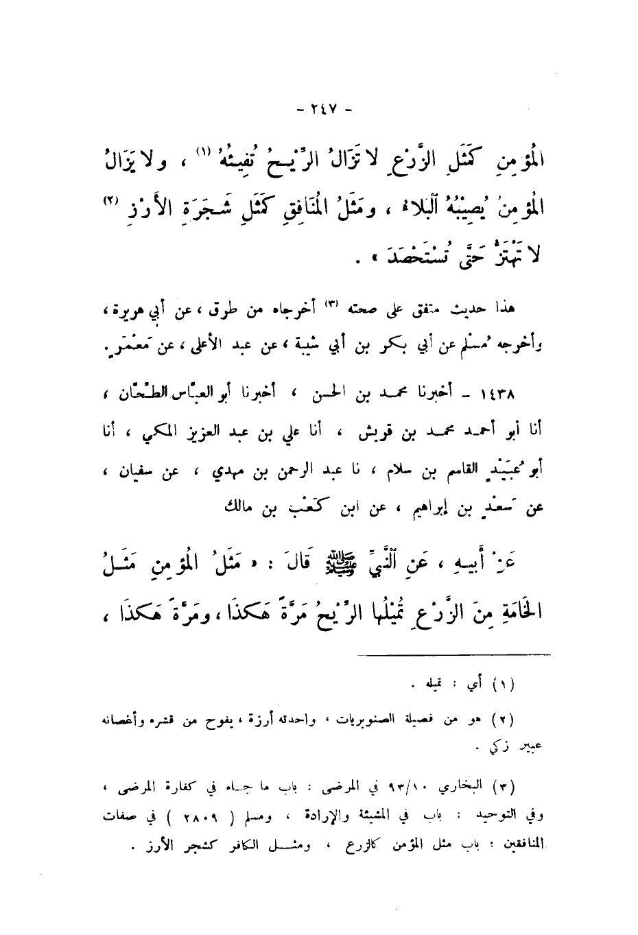1438 - أَخْبَرَنَا مُحَمَّدُ بْنُ الْحَسَنِ، أَخْبَرَنَا أَبُو الْعَبَّاسِ الطَّحَّانُ، أَنا أَبُو أَحْمَدَ مُحَمَّدُ بْنُ قُرَيْشٍ، أَنا عَلِيُّ بْنُ عَبْدِ الْعَزِيزِ الْمَكِّيُّ، أَنا أَبُو عُبَيْدٍ الْقَاسِمُ بْنُ سَلامٍ، نَا عَبْدُ الرَّحْمَنِ بْنُ مَهْدِيٍّ، عَنْ سُفْيَانَ، عَنْ سَعْدِ بْنِ إِبْرَاهِيمَ، عَنِ ابْنِ كَعْبِ بْنِ مَالِكٍ، عَنْ أَبِيهِ، عَنِ النَّبِيِّ صَلَّى اللهُ عَلَيْهِ وَسَلَّمَ، قَالَ: «مَثَلُ الْمُؤْمِنِ مَثَلُ الْخَامَةِ مِنَ الزَّرْعِ تُمِيلُهَا الرِّيحُ مَرَّةً هَكَذَا، وَمَرَّةً هَكَذَا،