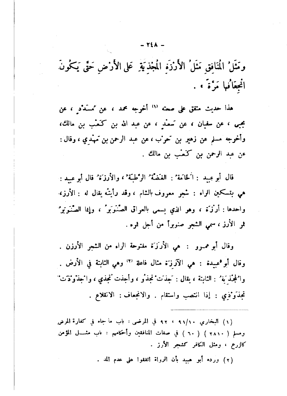 وَمَثَلُ الْمُنَافِقِ مَثَلُ الأَرْزَةِ الْمُجْذِيَةِ عَلَى الأَرْضِ حَتَّى يَكُونَ انْجِعَافُهَا مَرَّةً».