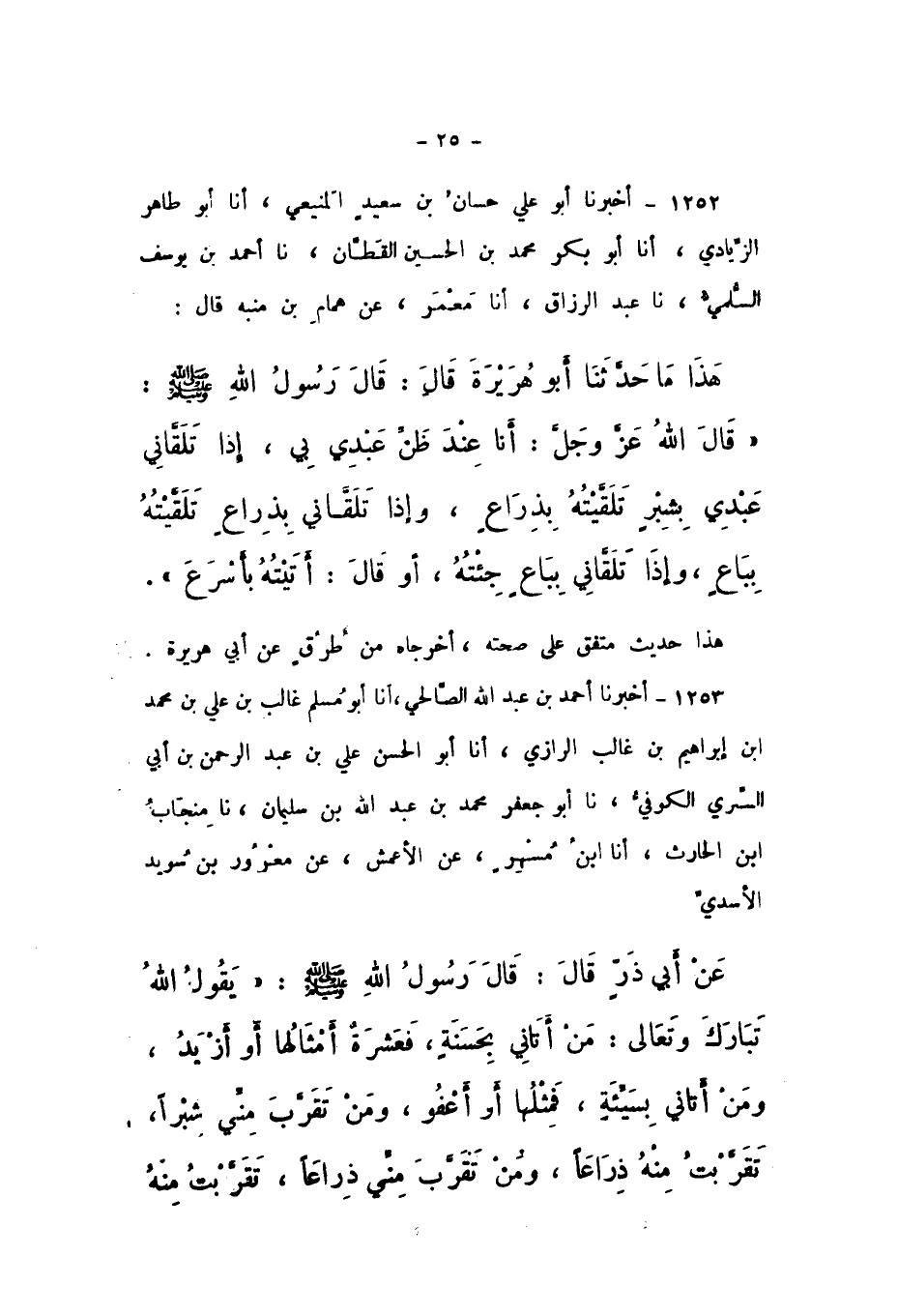 1252 - أَخْبَرَنَا أَبُو عَلِيٍّ حَسَّانُ بْنُ سَعِيدٍ الْمَنِيعِيُّ، أَنا أَبُو طَاهِرٍ الزِّيَادِيُّ، أَنا أَبُو بَكْرٍ مُحَمَّدُ بْنُ الْحُسَيْنِ الْقَطَّانُ، نَا أَحْمَدُ بْنُ يُوسُفَ السُّلَمِيُّ، نَا عَبْدُ الرَّزَّاقِ، أَنا مَعْمَرٌ، عَنْ هَمَّامِ بْنِ مُنَبِّهٍ، قَالَ: هَذَا مَا حَدَّثَنَا أَبُو هُرَيْرَةَ، قَالَ: قَالَ رَسُولُ اللَّهِ صَلَّى اللهُ عَلَيْهِ وَسَلَّمَ: قَالَ اللَّهُ عَزَّ وَجَلَّ: " أَنَا عِنْدَ ظَنِّ عَبْدِي بِي، إِذَا تَلَقَّانِي عَبْدِي بِشِبْرٍ تَلَقَّيْتُهُ بِذِرَاعٍ، وَإِذَا تَلَقَّانِي بِذِرَاعٍ تَلَقَّيْتُهُ بِبَاعٍ، وَإِذَا تَلَقَّانِي بِبَاعٍ جِئْتُهُ، أَوْ قَالَ: أَتَيْتُهُ بِأَسْرَعَ ".