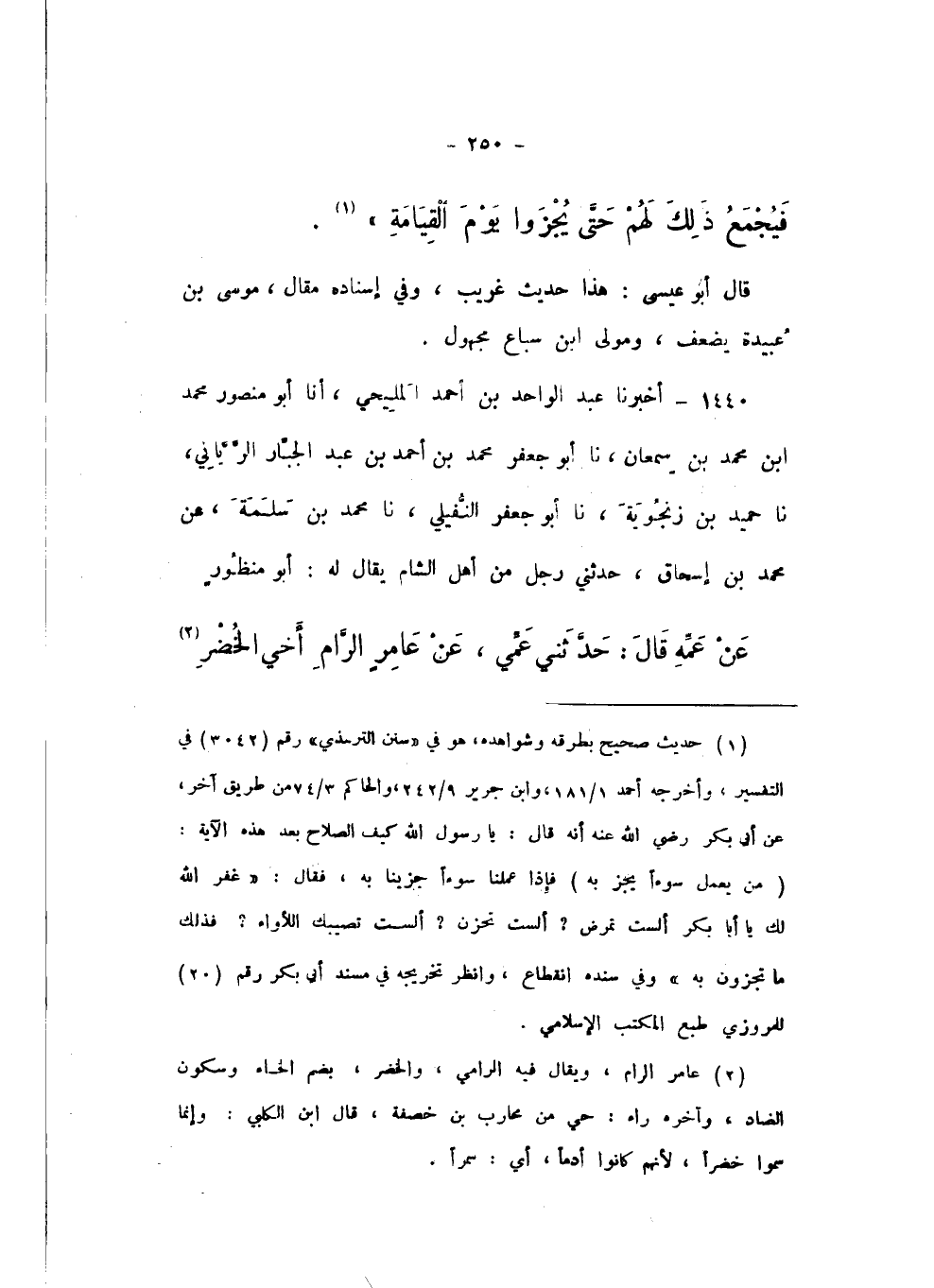 1440 - أَخْبَرَنَا عَبْدُ الْوَاحِدِ بْنُ أَحْمَدَ الْمَلِيحِيُّ، أَنا أَبُو مَنْصُورٍ مُحَمَّدُ بْنُ مُحَمَّدِ بْنِ سَمْعَانَ، نَا أَبُو جَعْفَرٍ مُحَمَّدُ بْنُ أَحْمَدَ بْنِ عَبْدِ الْجَبَّارِ الرَّيَّانِيُّ، نَا حُمَيْدُ بْنُ زَنْجُوَيْهِ، نَا أَبُو جَعْفَرٍ النُّفَيْلِيُّ، نَا مُحَمَّدُ بْنُ سَلَمَةَ، عَنْ مُحَمَّدِ بْنِ إِسْحَاقَ، حَدَّثَنِي رَجُلٌ مِنْ أَهْلِ الشَّامِ، يُقَالُ لَهُ: أَبُو مَنْظُورٍ , عَنْ عَمِّهِ، قَالَ: حَدَّثَنِي عَمِّي، عَنْ عَامِرٍ الرَّامِ أَخِي الْخَضِرِ،