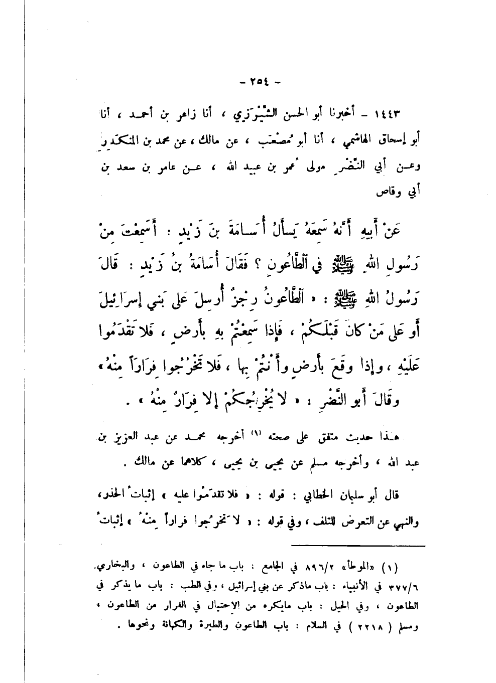 1443 - أَخْبَرَنَا أَبُو الْحَسَنِ الشِّيرَزِيُّ، أَنا زَاهِرُ بْنُ أَحْمَدَ، أَنا أَبُو إِسْحَاقَ الْهَاشِمِيُّ، أَنا أَبُو مُصْعَبٍ، عَنْ مَالِكٍ، عَنْ مُحَمَّدِ بْنِ الْمُنْكَدِرِ، وَعَنْ أَبِي النَّضْرِ مَوْلَى عُمَرَ بْنِ عُبَيْدِ اللَّهِ، عَنْ عَامِرِ بْنِ سَعْدِ بْنِ أَبِي وَقَّاصٍ، عَنْ أَبِيهِ، أَنَّهُ سَمِعَهُ يَسْأَلُ أُسَامَةَ بْنَ زَيْدٍ: أَسَمِعْتَ مِنْ رَسُولِ اللَّهِ صَلَّى اللهُ عَلَيْهِ وَسَلَّمَ فِي الطَّاعُونِ؟ فَقَالَ أُسَامَةُ بْنُ زَيْدٍ: قَالَ رَسُولُ اللَّهِ صَلَّى اللهُ عَلَيْهِ وَسَلَّمَ: «الطَّاعُونُ رِجْزٌ أُرْسِلَ عَلَى بَنِي إِسْرَائِيلَ، أَوْ عَلَى مَنْ كَانَ قَبْلَكُمْ، فَإِذَا سَمِعْتُمْ بِهِ بِأَرْضٍ، فَلا تَقْدَمُوا عَلَيْهِ، وَإِذَا وَقَعَ بِأَرْضٍ، وَأَنْتُمْ بِهَا، فَلا تَخْرُجُوا فِرَارًا مِنْهُ».