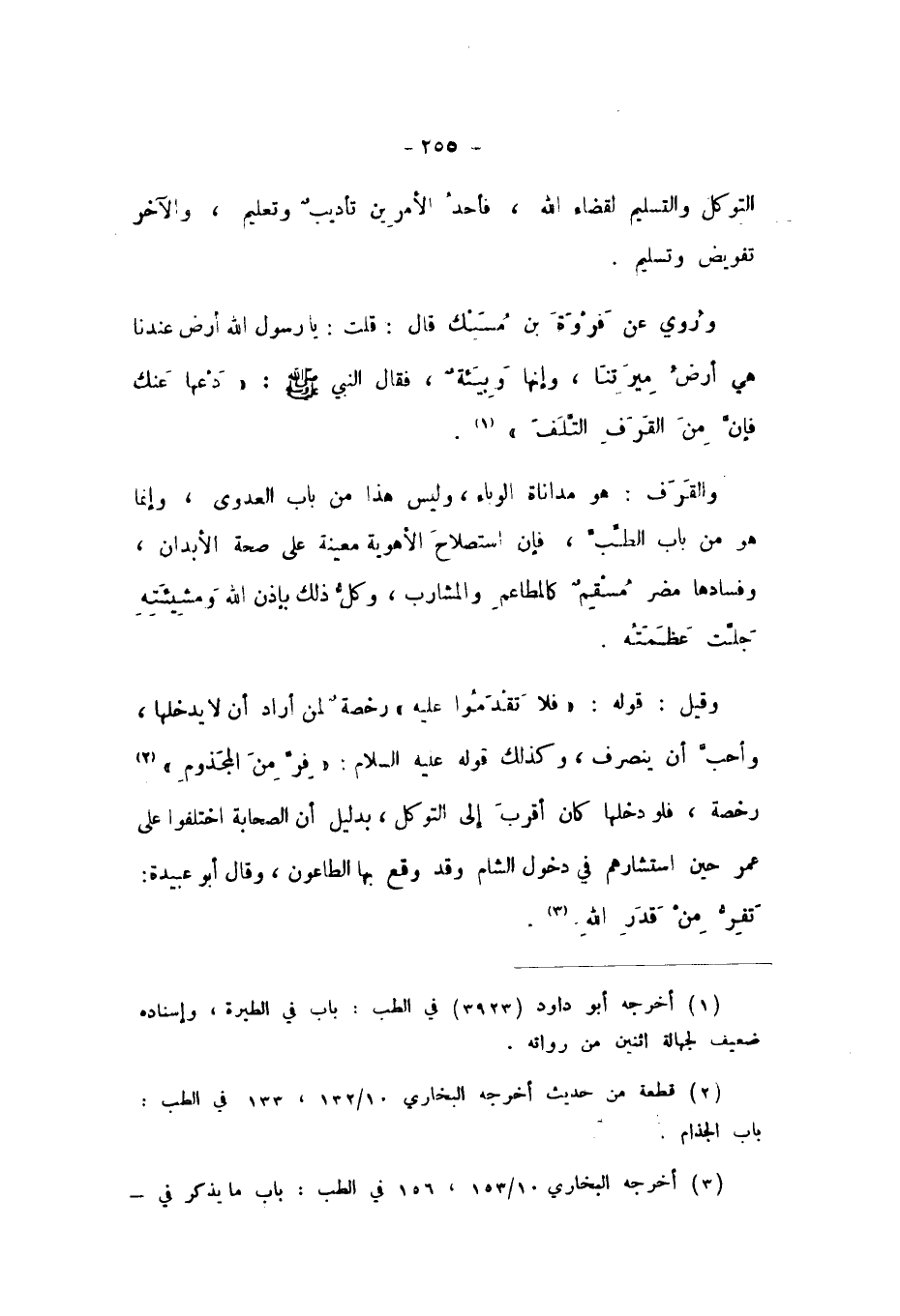وَقِيلَ: قَوْلُهُ: «فَلا تَقْدَمُوا عَلَيْهِ» رُخْصَةٌ لِمَنْ أَرَادَ أَنْ لَا يَدْخُلَهَا، وَأَحَبَّ أَنْ يَنْصَرِفَ، وَكَذَلِكَ قَوْلُهُ عَلَيْهِ السَّلامُ: «فِرَّ مِنَ الْمَجْذُومِ» رُخْصَةٌ، فَلَوْ دَخَلَهَا كَانَ أَقْرَبَ إِلَى التَّوَكُّلِ، بِدَلِيلِ أَنَّ الصَّحَابَةَ اخْتَلَفُوا عَلَى عُمَرَ حِينَ اسْتَشَارَهُمْ فِي دُخُولِ الشَّامِ، وَقَدْ وَقَعَ بِهَا الطَّاعُونُ، وَقَالَ أَبُو عُبَيْدَةَ: تَفِرُّ مِنْ قَدَرِ اللَّهِ.