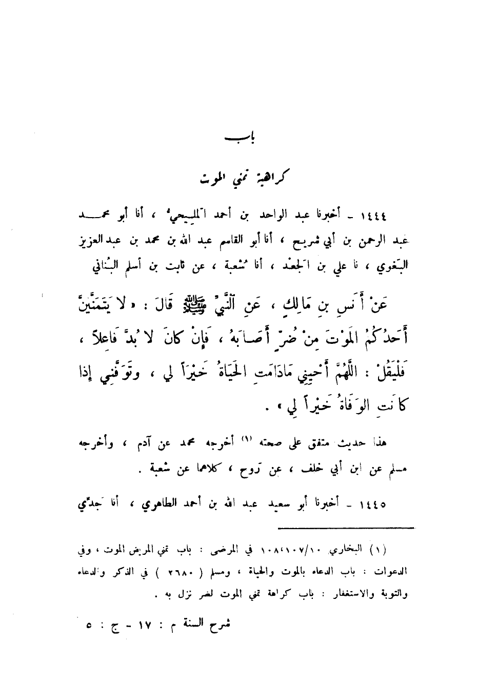 1444 - أَخْبَرَنَا عَبْدُ الْوَاحِدِ بْنُ أَحْمَدَ الْمَلِيحِيُّ، أَنا أَبُو مُحَمَّدٍ عَبْدُ الرَّحْمَنِ بْنُ أَبِي شُرَيْحٍ، أَنا أَبُو الْقَاسِمِ عَبْدُ اللَّهِ بْنُ مُحَمَّدِ بْنِ عَبْدِ الْعَزِيزِ الْبَغَوِيُّ، نَا عَلِيُّ بْنُ الْجَعْدِ، أَنا شُعْبَةُ، عَنْ ثَابِتِ بْنِ أَسْلَمَ الْبُنَانِيِّ، عَنْ أَنَسِ بْنِ مَالِكٍ، عَنِ النَّبِيِّ صَلَّى اللهُ عَلَيْهِ وَسَلَّمَ، قَالَ: " لَا يَتَمَنَّيَنَّ أَحَدُكُمُ الْمَوْتَ مِنْ ضُرٍّ أَصَابَهُ، فَإِنْ كَانَ لَا بُدَّ فَاعِلا، فَلْيَقُلِ: اللَّهُمَّ أَحْيِنِي مَا دَامَتِ الْحَيَاةُ خَيْرًا لِي، وَتَوَفَّنِي إِذَا كَانَتِ الْوَفَاةُ خَيْرًا لِي ".