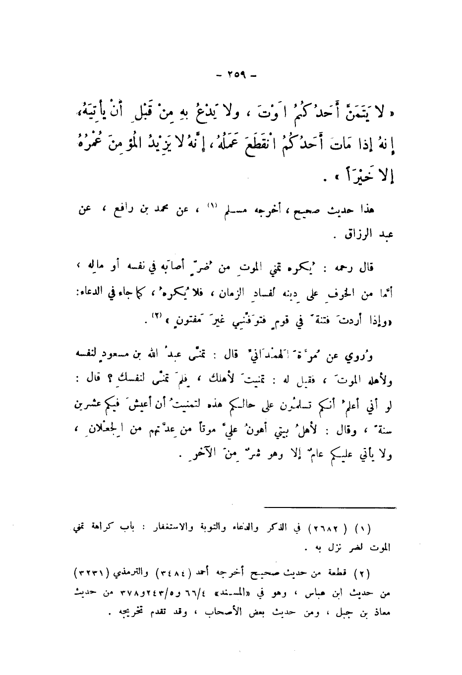 قَالَ رَحِمَهُ اللَّهُ: " يُكْرَهُ تَمَنِّي الْمَوْتِ مِنْ ضُرٍّ أَصَابَهُ فِي نَفْسِهِ أَوْ مَالِهِ، أَمَّا مِنَ الْخَوْفِ عَلَى دِينِهِ لِفَسَادِ الزَّمَانِ، فَلا يُكْرَهُ، كَمَا جَاءَ فِي الدُّعَاءِ: «وَإِذَا أَرَدْتَ فِتْنَةً فِي قَوْمٍ فَتَوَفَّنِي غَيْرَ مَفْتُونٍ».