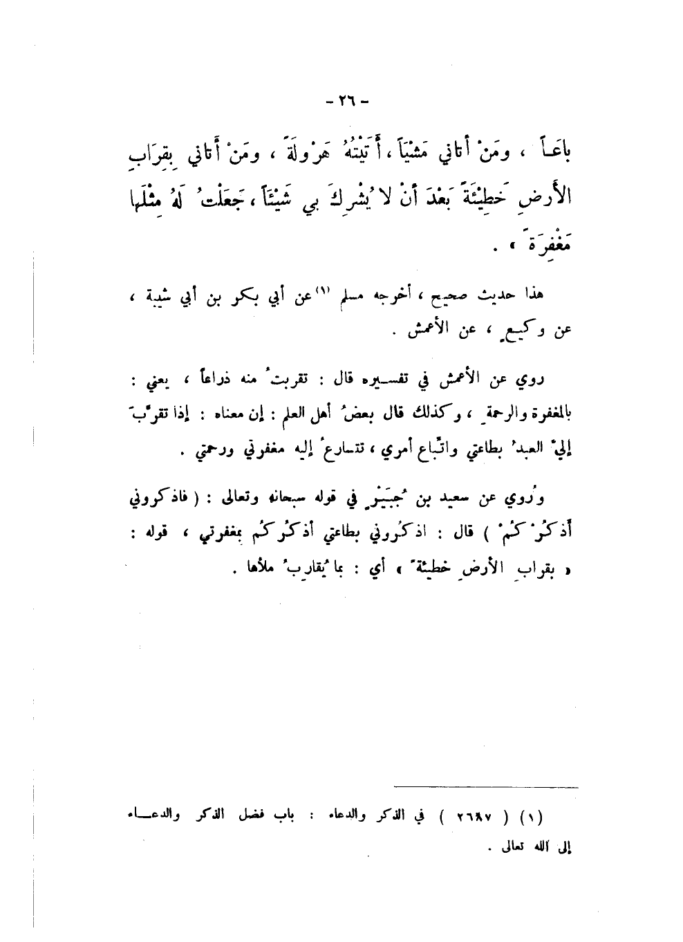 وَرُوِيَ عَنْ سَعِيدِ بْنِ جُبَيْرٍ، فِي قَوْلِهِ سُبْحَانَهُ وَتَعَالَى: {فَاذْكُرُونِي أَذْكُرْكُمْ} [الْبَقَرَة: 152]، قَالَ: اذْكُرُونِي بِطَاعَتِي أَذْكُرْكُمْ بِمَغْفِرَتِي، قَوْلُهُ: «بِقُرَابِ الأَرْضِ خَطِيئَةً» أَيْ: بِمَا يُقَارِبُ مِلأَهَا.