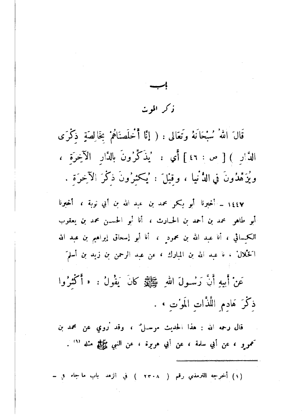 1447 - أَخْبَرَنَا أَبُو بَكْرٍ مُحَمَّدُ بْنُ عَبْدِ اللَّهِ بْنِ أَبِي تَوْبَةَ، أَخْبَرَنَا أَبُو طَاهِرٍ مُحَمَّدُ بْنُ أَحْمَدَ بْنِ الْحَارِثِ، أَنا أَبُو الْحَسَنِ مُحَمَّدُ بْنُ يَعْقُوبَ الْكِسَائِيُّ، أَنا عَبْدُ اللَّهِ بْنُ مَحْمُودٍ، أَنا أَبُو إِسْحَاقَ إِبْرَاهِيمُ بْنُ عَبْدِ اللَّهِ الْخَلالُ، نَا عَبْدُ اللَّهِ بْنُ الْمُبَارَكِ، عَنْ عَبْدِ الرَّحْمَنِ بْنِ زَيْدِ بْنِ أَسْلَمَ، عَنْ أَبِيهِ، أَنّ رَسُولَ اللَّهِ صَلَّى اللهُ عَلَيْهِ وَسَلَّمَ، كَانَ يَقُولُ: «أَكْثِرُوا ذِكْرَ هَادِمِ اللَّذَّاتِ، الْمَوْتِ».