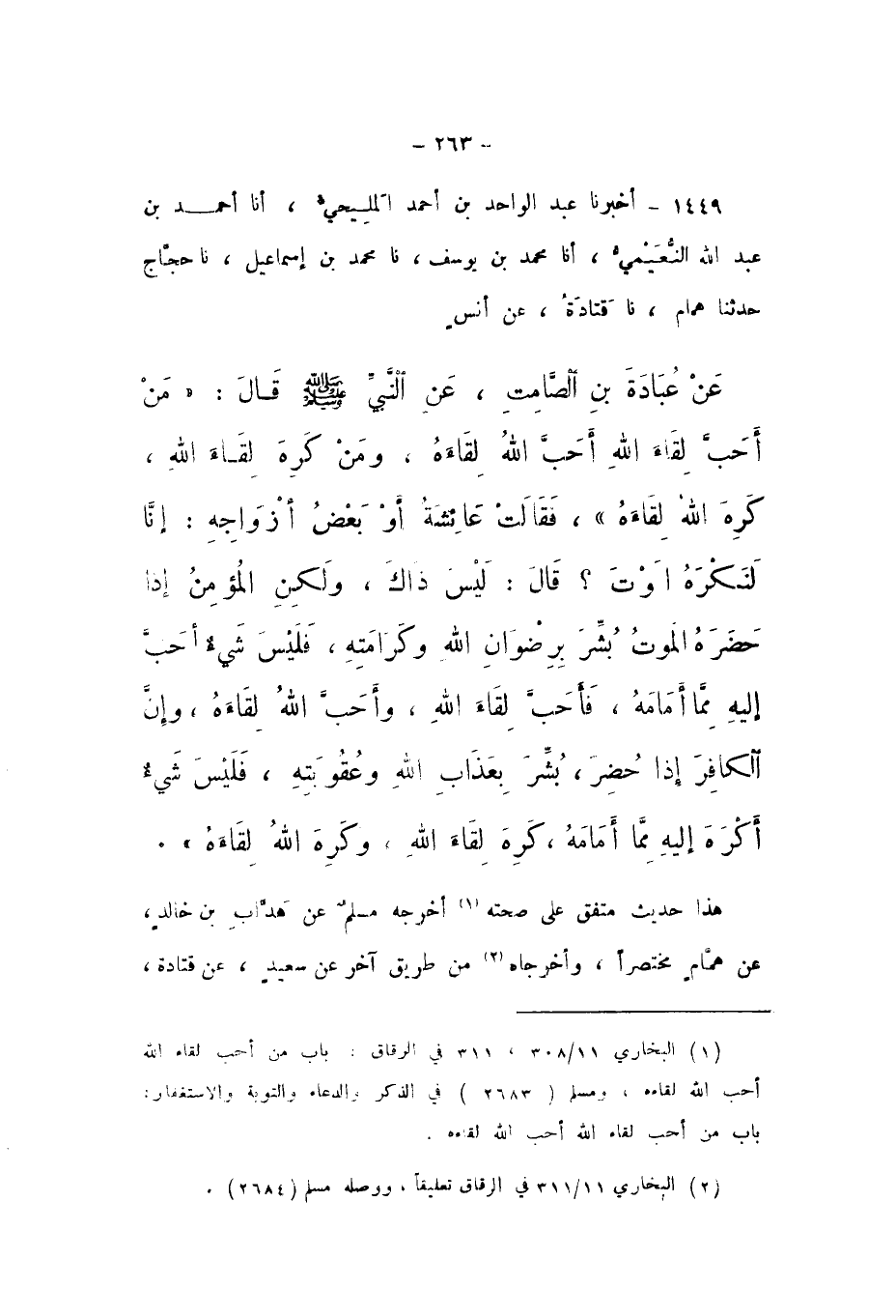 1449 - أَخْبَرَنَا عَبْدُ الْوَاحِدِ بْنُ أَحْمَدَ الْمَلِيحِيُّ، أَنا أَحْمَدُ بْنُ عَبْدِ اللَّهِ النُّعَيْمِيُّ، أَنا مُحَمَّدُ بْنُ يُوسُفَ، نَا مُحَمَّدُ بْنُ إِسْمَاعِيلَ، نَا حَجَّاجٌ، حَدَّثَنَا هَمَّامٌ، نَا قَتَادَةُ، عَنْ أَنَسٍ، عَنْ عُبَادَةَ بْنِ الصَّامِتِ، عَنِ النَّبِيِّ صَلَّى اللهُ عَلَيْهِ وَسَلَّمَ، قَالَ: «مَنْ أَحَبَّ لِقَاءَ اللَّهِ أَحَبَّ اللَّهُ لِقَاءَهُ، وَمَنْ كَرِهَ لِقَاءَ اللَّهِ، كَرِهَ اللَّهُ لِقَاءَهُ»، فَقَالَتْ عَائِشَةُ أَوْ بَعْضُ أَزْوَاجِهِ: إِنَّا لَنَكْرَهُ الْمَوْتَ؟ قَالَ: «لَيْسَ ذَاكَ، وَلَكِنَّ الْمُؤْمِنَ إِذَا حَضَرَهُ الْمَوْتُ بُشِّرَ بِرِضْوَانِ اللَّهِ وَكَرَامَتِهِ، فَلَيْسَ شَيْءٌ أَحَبَّ إِلَيْهِ مِمَّا أَمَامَهُ، فَأَحَبَّ لِقَاءَ اللَّهِ، وَأَحَبَّ اللَّهُ لِقَاءَهُ، وَإِنَّ الْكَافِرَ إِذَا حُضِرَ، بُشِّرَ بِعَذَابِ اللَّهِ وَعُقُوبَتِهِ، فَلَيْسَ شَيْءٌ أَكْرَهَ إِلَيْهِ مِمَّا أَمَامَهُ، كَرِهَ لِقَاءَ اللَّهِ، وَكَرِهَ اللَّهُ لِقَاءَهُ».