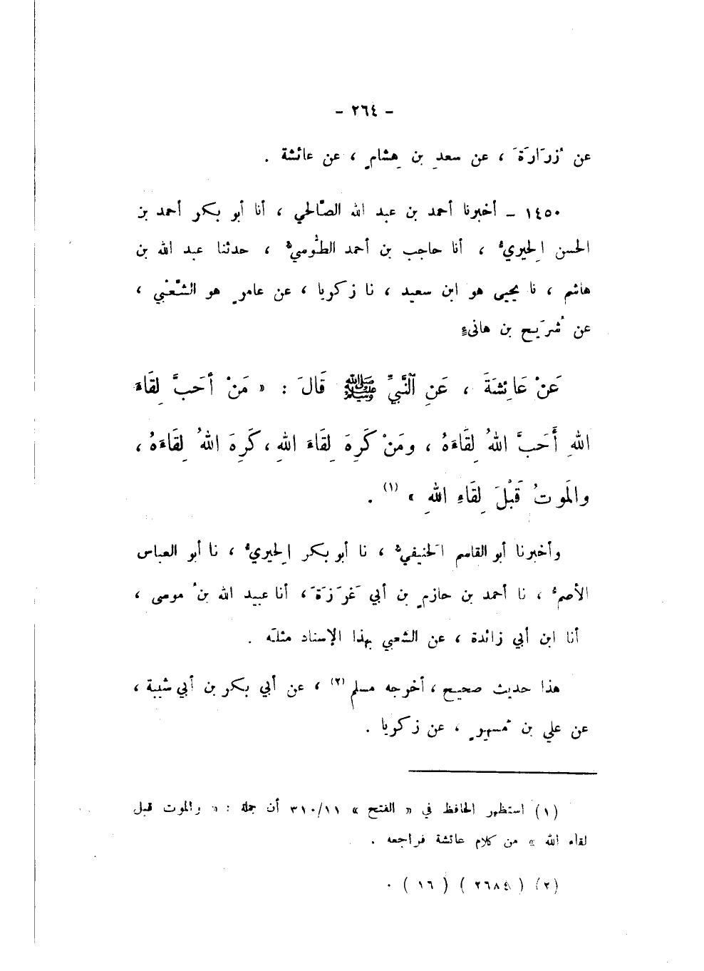1450 - أَخْبَرَنَا أَحْمَدُ بْنُ عَبْدِ اللَّهِ الصَّالِحِيُّ، أَنا أَبُو بَكْرٍ أَحْمَدُ بْنُ الْحَسَنِ الْحِيرِيُّ، أَنا حَاجِبُ بْنُ أَحْمَدَ الطُّوسِيُّ، حَدَّثَنَا عَبْدُ اللَّهِ بْنُ هَاشِمٍ، نَا يَحْيَى هُوَ ابْنُ سَعِيدٍ، نَا زَكَرِيَّا، عَنْ عَامِرٍ هُوَ الشَّعْبِيُّ، عَنْ شُرَيْحِ بْنِ هَانِئٍ، عَنْ عَائِشَةَ، عَنِ النَّبِيِّ صَلَّى اللهُ عَلَيْهِ وَسَلَّمَ، قَالَ: «مَنْ أَحَبَّ لِقَاءَ اللَّهِ أَحَبَّ اللَّهُ لِقَاءَهُ، وَمَنْ كَرِهَ لِقَاءَ اللَّهِ، كَرِهَ اللَّهُ لِقَاءَهُ، وَالْمَوْتُ قَبْلَ لِقَاءِ اللَّهِ».