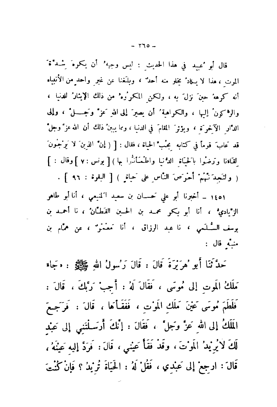 1451 - أَخْبَرَنَا أَبُو عَلِيٍّ حَسَّانُ بْنُ سَعِيدٍ الْمَنِيعِيُّ، أَنا أَبُو طَاهِرٍ الزِّيَادِيُّ، أَنا أَبُو بَكْرٍ مُحَمَّدُ بْنُ الْحُسَيْنِ الْقَطَّانُ، نَا أَحْمَدُ بْنُ يُوسُفَ السُّلَمِيُّ، نَا عَبْدُ الرَّزَّاقِ، أَنا مَعْمَرٌ، عَنْ هَمَّامِ بْنِ مُنَبِّهٍ، قَالَ: حَدَّثَنَا أَبُو هُرَيْرَةَ، قَالَ: قَالَ رَسُولُ اللَّهِ صَلَّى اللهُ عَلَيْهِ وَسَلَّمَ: " جَاءَ مَلَكُ الْمَوْتِ إِلَى مُوسَى، فَقَالَ لَهُ: أَجِبْ رَبَّكَ، قَالَ: فَلَطَمَ مُوسَى عَيْنَ مَلَكِ الْمَوْتِ، فَفَقَأَهَا، قَالَ: فَرَجَعَ الْمَلَكُ إِلَى اللَّهِ عَزَّ وَجَلَّ فَقَالَ: إِنَّكَ أَرْسَلْتَنِي إِلَى عَبْدٍ لَكَ لَا يُرِيدُ الْمَوْتَ، وَقَدْ فَقَأَ عَيْنِي، قَالَ: فَرَدَّ إِلَيْهِ عَيْنَهُ، قَالَ: ارْجِعْ إِلَى عَبْدِي، فَقُلْ لَهُ: الْحَيَاةَ تُرِيدُ؟ فَإِنْ كُنْتَ