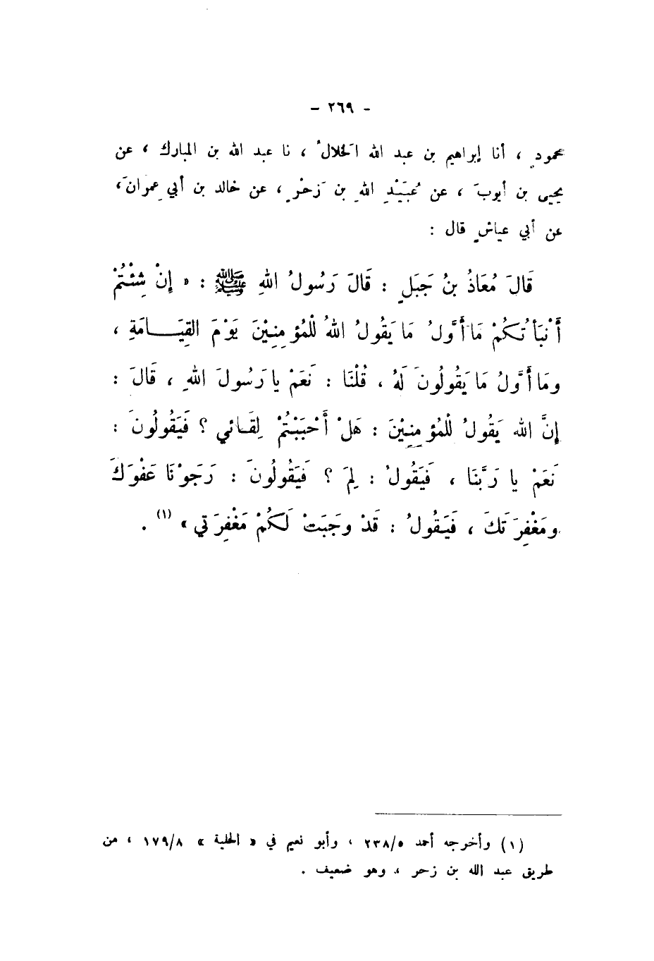 مَحْمُودٍ، أَنا إِبْرَاهِيمُ بْنُ عَبْدِ اللَّهِ الْخَلالُ، نَا عَبْدُ اللَّهِ بْنُ الْمُبَارَكِ، عَنْ يَحْيَى بْنِ أَيُّوبَ، عَنْ عُبَيْدِ اللَّهِ بْنِ زَحْرٍ، عَنْ خَالِدِ بْنِ أَبِي عِمْرَانَ، عَنْ أَبِي عَيَّاشٍ، قَالَ: قَالَ مُعَاذُ بْنُ جَبَلٍ: قَالَ رَسُولُ اللَّهِ صَلَّى اللهُ عَلَيْهِ وَسَلَّمَ: «إِنْ شِئْتُمْ أَنْبَأْتُكُمْ مَا أَوَّلُ مَا يَقُولُ اللَّهُ لِلْمُؤْمِنِينَ يَوْمَ الْقِيَامَةِ، وَمَا أَوَّلُ مَا يَقُولُونَ لَهُ»، قُلْنَا: نَعَمْ يَا رَسُولَ اللَّهِ، قَالَ: " إِنَّ اللَّهَ يَقُولُ لِلْمُؤْمِنِينَ: هَلْ أَحْبَبْتُمْ لِقَائِي؟ فَيَقُولُونَ: نَعَمْ يَا رَبَّنَا، فَيَقُولُ: لِمَ؟ فَيَقُولُونَ: رَجَوْنَا عَفْوَكَ وَمَغْفِرَتَكَ، فَيَقُولُ: قَدْ وَجَبَتْ لَكُمْ مَغْفِرَتِي "