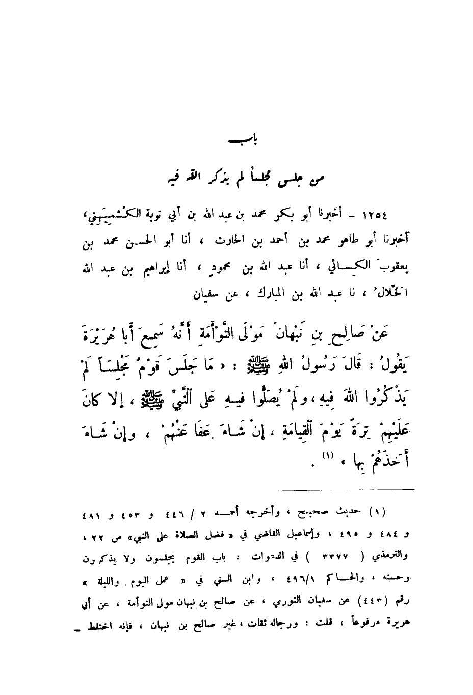 1254 - أَخْبَرَنَا أَبُو بَكْرٍ مُحَمَّدُ بْنُ عَبْدِ اللَّهِ بْنِ أَبِي تَوْبَةَ الْكُشْمِيهَنِيُّ، أَخْبَرَنَا أَبُو طَاهِرٍ مُحَمَّدُ بْنُ أَحْمَدَ بْنِ الْحَارِثِ، أَنا أَبُو الْحَسَنِ مُحَمَّدُ بْنُ يَعْقُوبَ الْكِسَائِيُّ، أَنا عَبْدُ اللَّهِ بْنُ مَحْمُودٍ، أَنا إِبْرَاهِيمُ بْنُ عَبْدِ اللَّهِ الْخَلالُ، نَا عَبْدُ اللَّهِ بْنُ الْمُبَارَكِ، عَنْ سُفْيَانَ، عَنْ صَالِحِ بْنِ نَبْهَانَ مَوْلَى التَّوْءَمَةِ، أَنَّهُ سَمِعَ أَبَا هُرَيْرَةَ، يَقُولُ: قَالَ رَسُولُ اللَّهِ صَلَّى اللهُ عَلَيْهِ وَسَلَّمَ: «مَا جَلَسَ قَوْمٌ مَجْلِسًا لَمْ يَذْكُرُوا اللَّهَ فِيهِ، وَلَمْ يُصَلُّوا فِيهِ عَلَى النَّبِيِّ صَلَّى اللهُ عَلَيْهِ وَسَلَّمَ، إِلا كَانَ عَلَيْهِمْ تِرَةً يَوْمَ الْقِيَامَةِ، إِنْ شَاءَ عَفَا عَنْهُمْ، وَإِنْ شَاءَ أَخَذَهُمْ بِهَا».