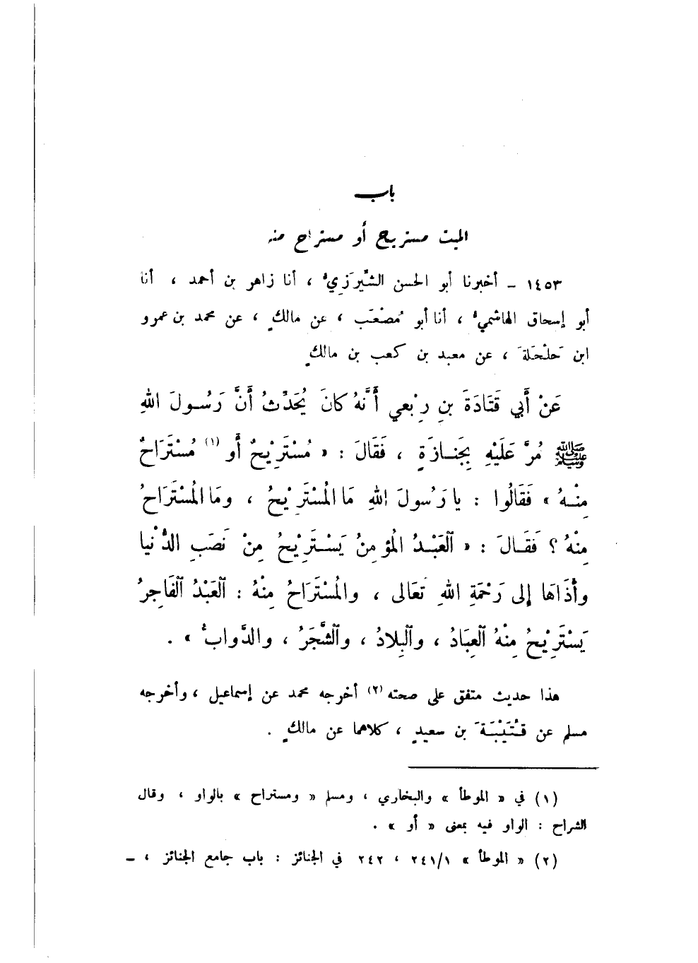 1453 - أَخْبَرَنَا أَبُو الْحَسَنِ الشِّيرَزِيُّ، أَنا زَاهِرُ بْنُ أَحْمَدَ، أَنا أَبُو إِسْحَاقَ الْهَاشِمِيُّ، أَنا أَبُو مُصْعَبٍ، عَنْ مَالِكٍ، عَنْ مُحَمَّدِ بْنِ عَمْرِو بْنِ حَلْحَلَةَ، عَنْ مَعْبَدِ بْنِ كَعْبِ بْنِ مَالِكٍ، عَنْ أَبِي قَتَادَةَ بْنِ رِبْعِيٍّ، أَنَّهُ كَانَ يُحَدِّثُ أَنَّ رَسُولَ اللَّهِ صَلَّى اللهُ عَلَيْهِ وَسَلَّمَ مُرَّ عَلَيْهِ بِجِنَازَةٍ، فَقَالَ: «مُسْتَرِيحٌ أَوْ مُسْتَرَاحٌ مِنْهُ»، فَقَالُوا: يَا رَسُولَ اللَّهِ مَا الْمُسْتَرِيحُ، وَمَا الْمُسْتَرَاحُ مِنْهُ؟ فَقَالَ: " الْعَبْدُ الْمُؤْمِنُ يَسْتَرِيحُ مِنْ نَصَبِ الدُّنْيَا وَأَذَاهَا إِلَى رَحْمَةِ اللَّهِ تَعَالَى، وَالْمُسْتَرَاحُ مِنْهُ: الْعَبْدُ الْفَاجِرُ يَسْتَرِيحُ مِنْهُ الْعِبَادُ، وَالْبِلادُ، وَالشَّجَرُ وَالدَّوَابُّ ".