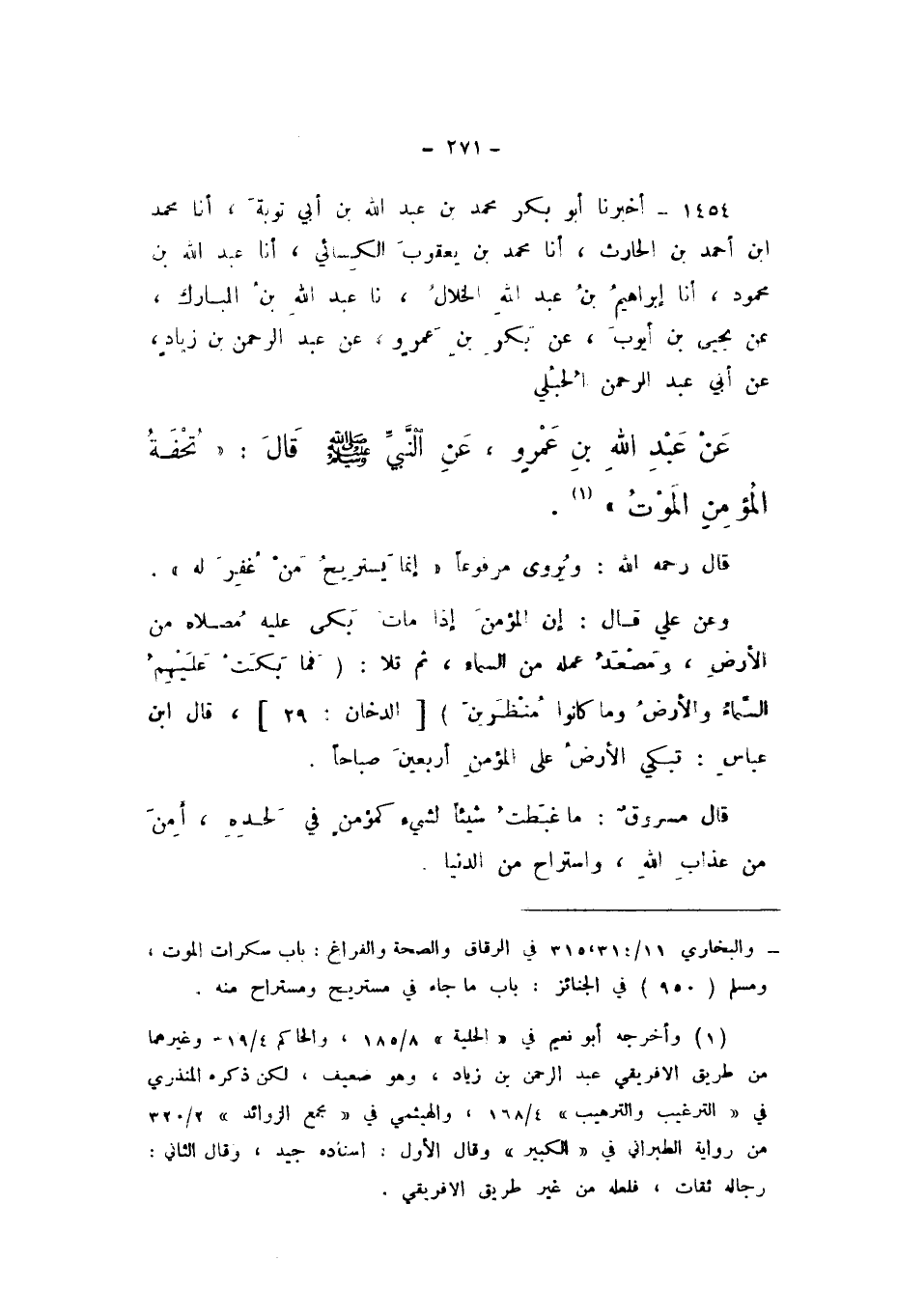 1454 - أَخْبَرَنَا أَبُو بَكْرٍ مُحَمَّدُ بْنُ عَبْدِ اللَّهِ بْنِ أَبِي تَوْبَةَ، أَنا مُحَمَّدُ بْنُ أَحْمَدَ بْنِ الْحَارِثِ، أَنا مُحَمَّدُ بْنُ يَعْقُوبَ الْكِسَائِيُّ، أَنا عَبْدُ اللَّهِ بْنُ مَحْمُودٍ، أَنا إِبْرَاهِيمُ بْنُ عَبْدِ اللَّهِ الْخَلالُ، نَا عَبْدُ اللَّهِ بْنُ الْمُبَارَكِ، عَنْ يَحْيَى بْنِ أَيُّوبَ، عَنْ بَكْرِ بْنِ عَمْرٍو، عَنْ عَبْدِ الرَّحْمَنِ بْنِ زِيَادٍ، عَنْ أَبِي عَبْدِ الرَّحْمَنِ الْحُبُلِيِّ، عَنْ عَبْدِ اللَّهِ بْنِ عَمْرٍو، عَنِ النَّبِيِّ صَلَّى اللهُ عَلَيْهِ وَسَلَّمَ، قَالَ: «تُحْفَةُ الْمُؤْمِنِ الْمَوْتُ»