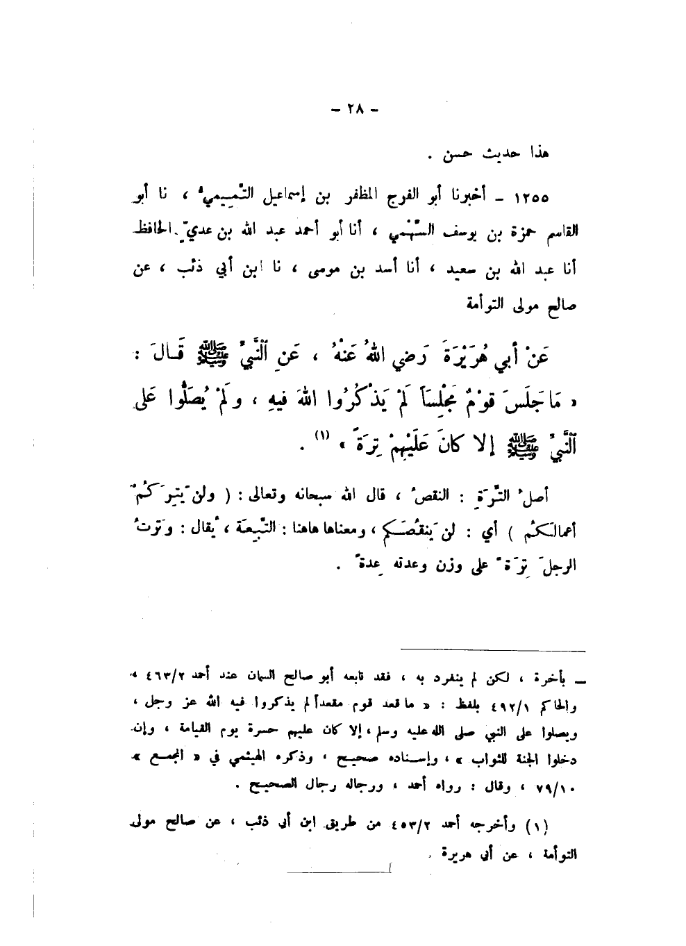 1255 - أَخْبَرَنَا أَبُو الْفَرَجِ الْمُظَفَّرُ بْنُ إِسْمَاعِيلَ التَّمِيمِيُّ، نَا أَبُو الْقَاسِمِ حَمْزَةُ بْنُ يُوسُفَ السَّهْمِيُّ، أَنا أَبُو أَحْمَدَ عَبْدُ اللَّهِ بْنُ عَدِيٍّ الْحَافِظُ، أَنا عَبْدُ اللَّهِ بْنُ سَعِيدٍ، أَنا أَسَدُ بْنُ مُوسَى، نَا ابْنُ أَبِي ذِئْبٍ، عَنْ صَالِحٍ مَوْلَى التَّوْءَمَةِ، عَنْ أَبِي هُرَيْرَةَ رَضِيَ اللَّهُ عَنْهُ، عَنِ النَّبِيِّ صَلَّى اللهُ عَلَيْهِ وَسَلَّمَ، قَالَ: «مَا جَلَسَ قَوْمٌ مَجْلِسًا لَمْ يَذْكُرُوا اللَّهَ فِيهِ، وَلَمْ يُصَلُّوا عَلَى النَّبِيِّ صَلَّى اللهُ عَلَيْهِ وَسَلَّمَ إِلا كَانَ عَلَيْهِمْ تِرَةً»