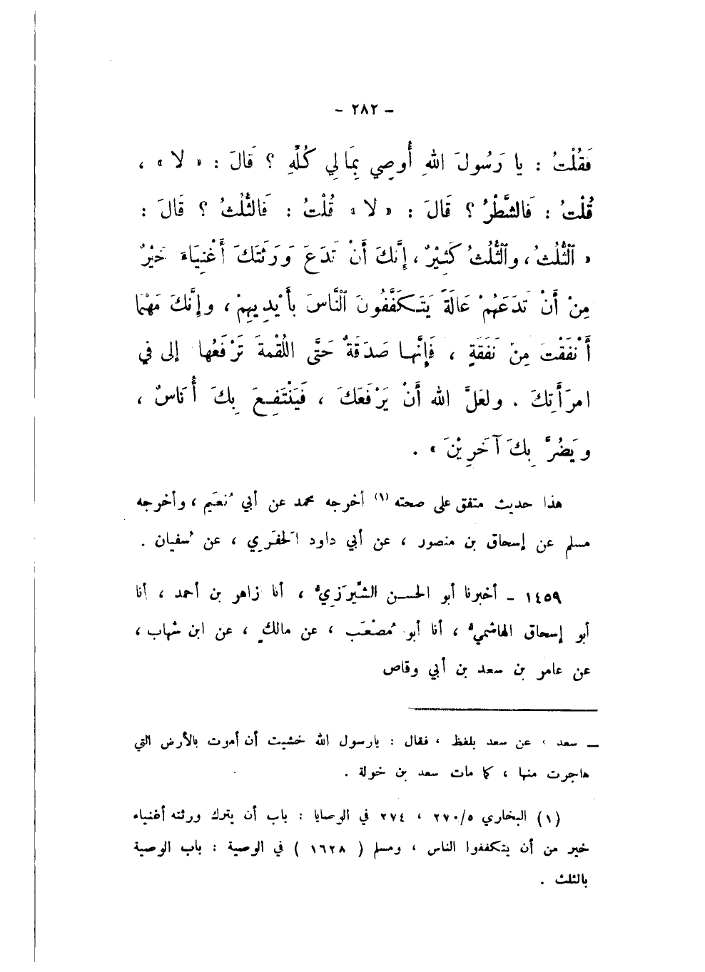 فَقُلْتُ: يَا رَسُولَ اللَّهِ أُوصِي بِمَالِي كُلِّهِ؟ قَالَ: «لَا»، قُلْتُ: فَالشَّطْرُ؟ قَالَ: «لَا»، قُلْتُ: فَالثُّلُثُ؟ قَالَ: «الثُّلُثُ، وَالثُّلُثُ كَثِيرٌ، إِنَّكَ أَنْ تَدَعَ وَرَثَتَكَ أَغْنِيَاءَ خَيْرٌ مِنْ أَنْ تَدَعَهُمْ عَالَةً يَتَكَفَّفُونَ النَّاسَ بِأَيْدِيهِمْ، وَإِنَّكَ مَهْمَا أَنْفَقْتَ مِنْ نَفَقَةٍ، فَإِنَّهَا صَدَقَةٌ حَتَّى اللُّقْمَةَ تَرْفَعُهَا إِلَى فِي امْرَأَتِكَ، وَلَعَلَّ اللَّهَ أَنْ يَرْفَعَكَ، فَيَنْتَفِعَ بِكَ أُنَاسٌ، وَيَضُرَّ بِكَ آخَرِينَ».