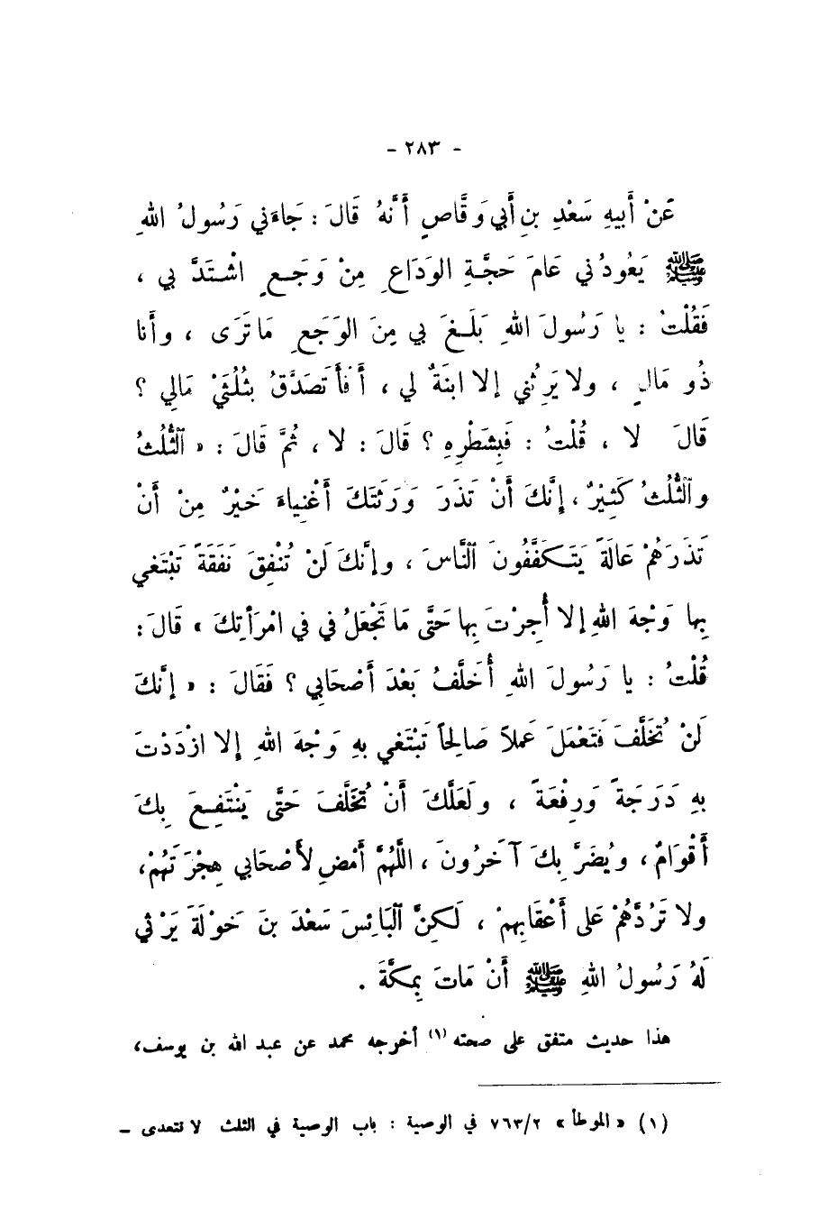 عَنْ أَبِيهِ سَعْدِ بْنِ أَبِي وَقَّاصٍ، أَنَّهُ قَالَ: جَاءَنِي رَسُولُ اللَّهِ صَلَّى اللهُ عَلَيْهِ وَسَلَّمَ يَعُودُنِي عَامَ حَجَّةِ الْوَدَاعِ مِنْ وَجَعٍ اشْتَدَّ بِي، فَقُلْتُ: يَا رَسُولَ اللَّهِ بَلَغَ بِي مِنَ الْوَجَعَ مَا تَرَى، وَأَنَا ذُو مَالٍ، وَلا يَرِثُنِي إِلا ابْنَةٌ لِي، أَفَأَتَصَدَّقُ بِثُلُثَيْ مَالِي؟ قَالَ: لَا، قُلْتُ: فَبِشَطْرِهِ؟ قَالَ: لَا، ثُمَّ قَالَ: «الثُّلُثُ وَالثُّلُثُ كَثِيرٌ، إِنَّكَ أَنْ تَذَرَ وَرَثَتَكَ أَغْنِيَاءَ، خَيْرٌ مِنْ أَنْ تَذَرَهُمْ عَالَةً يَتَكَفَّفُونَ النَّاسَ، وَإِنَّكَ لَنْ تُنْفِقَ نَفَقَةً تَبْتَغِي بِهَا وَجْهَ اللَّهِ إِلا أُجِرْتَ بِهَا، حَتَّى مَا تَجْعَلُ فِي فِي امْرَأَتِكَ»، قَالَ: قُلْتُ: يَا رَسُولَ اللَّهِ أُخَلَّفُ بَعْدَ أَصْحَابِي؟ فَقَالَ: «إِنَّكَ لَنْ تُخَلَّفَ فَتَعْمَلَ عَمَلا صَالِحًا تَبْتَغِي بِهِ وَجْهَ اللَّهِ إِلا ازْدَدْتَ بِهِ دَرَجَةً وَرِفْعَةً، وَلَعَلَّكَ أَنْ تُخَلَّفَ حَتَّى يَنْتَفِعَ بِكَ أَقْوَامٌ، وَيُضَرَّ بِكَ آخَرُونَ، اللَّهُمَّ أَمْضِ لأَصْحَابِي هِجْرَتَهُمْ، وَلا تَرُدَّهُمْ عَلَى أَعْقَابِهِمْ، لَكِنِ الْبَائِسُ سَعْدُ بْنُ خَوْلَةَ يَرْثِي لَهُ رَسُولُ اللَّهِ صَلَّى اللهُ عَلَيْهِ وَسَلَّمَ أَنْ مَاتَ بِمَكَّةَ».