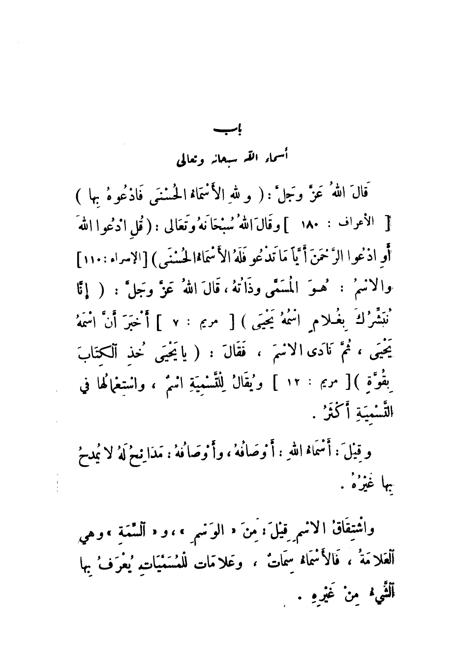 قَالَ اللَّهُ عَزَّ وَجَلَّ: {وَلِلَّهِ الأَسْمَاءُ الْحُسْنَى فَادْعُوهُ بِهَا} [الْأَعْرَاف: 180]، وَقَالَ اللَّهُ سُبْحَانَهُ وَتَعَالَى: {قُلِ ادْعُوا اللَّهَ أَوِ ادْعُوا الرَّحْمَنَ أَيًّا مَا تَدْعُوا فَلَهُ الأَسْمَاءُ الْحُسْنَى} [الْإِسْرَاء: 110] وَالاسْمُ: هُوَ الْمُسَمَّى وَذَاتُهُ، قَالَ اللَّهُ عَزَّ وَجَلَّ: {إِنَّا نُبَشِّرُكَ بِغُلامٍ اسْمُهُ يَحْيَى} [مَرْيَم: 7] أَخْبَرَ أَنَّ اسْمَهُ يَحْيَى، ثُمَّ نَادَى الاسْمَ، فَقَالَ: {يَا يَحْيَى خُذِ الْكِتَابَ بِقُوَّةٍ} [مَرْيَم: 12] وَيُقَالُ لِلتَّسْمِيَةِ اسْمٌ، وَاسْتِعْمَالُهَا فِي التَّسْمِيَةِ أَكْثَرُ.