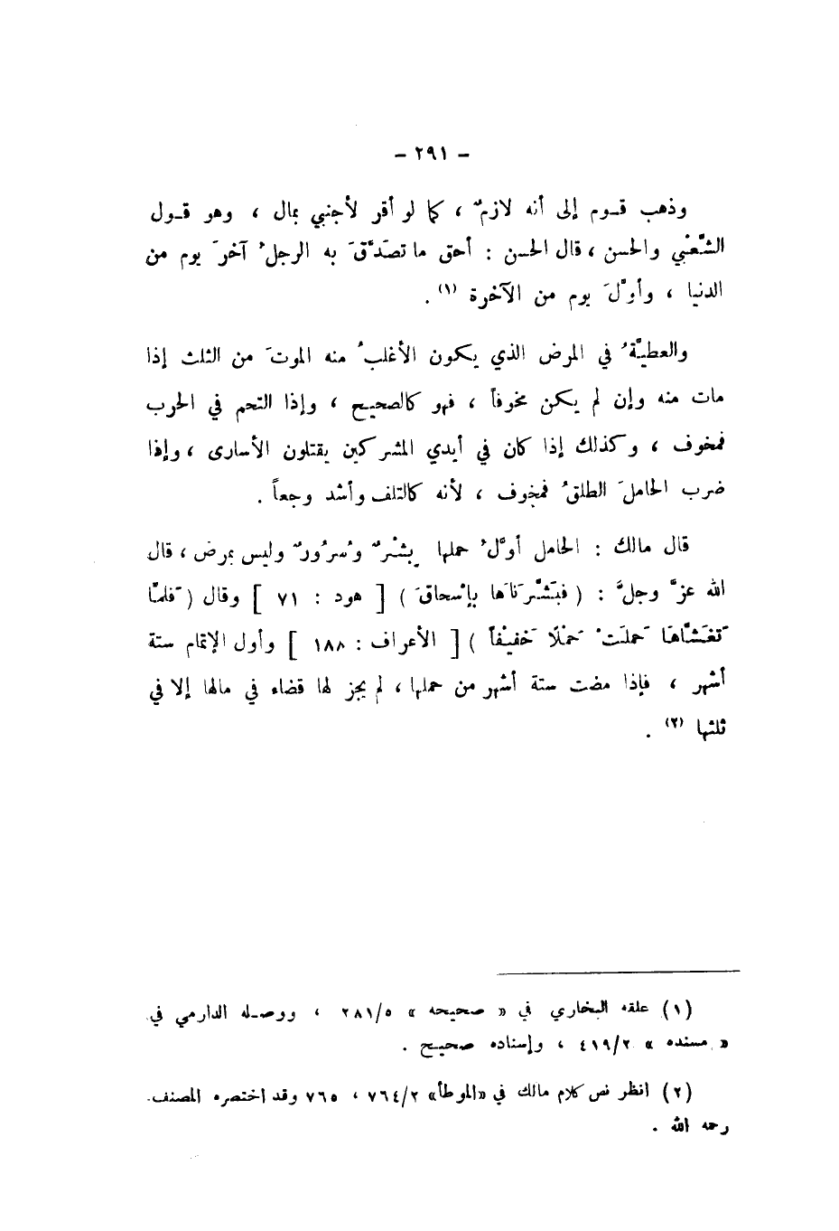 قَالَ مَالِكٌ: الْحَامِلُ أَوَّلُ حَمْلِهَا بِشْرٌ وَسُرُورٌ، وَلَيْسَ بِمَرَضٍ، قَالَ اللَّهُ عَزَّ وَجَلَّ: {فَبَشَّرْنَاهَا بِإِسْحَاقَ} [هود: 71]، وَقَالَ: {فَلَمَّا تَغَشَّاهَا حَمَلَتْ حَمْلا خَفِيفًا} [الْأَعْرَاف: 189] وَأَوَّلُ الإِتْمَامِ سِتَّةُ أَشْهُرٍ، فَإِذَا مَضَتْ سِتَّةُ أَشْهُرٍ مِنْ حَمْلِهَا، لَمْ يَجُزْ لَهَا قَضَاءٌ فِي مَالِهَا إِلا فِي ثُلُثِهَا
