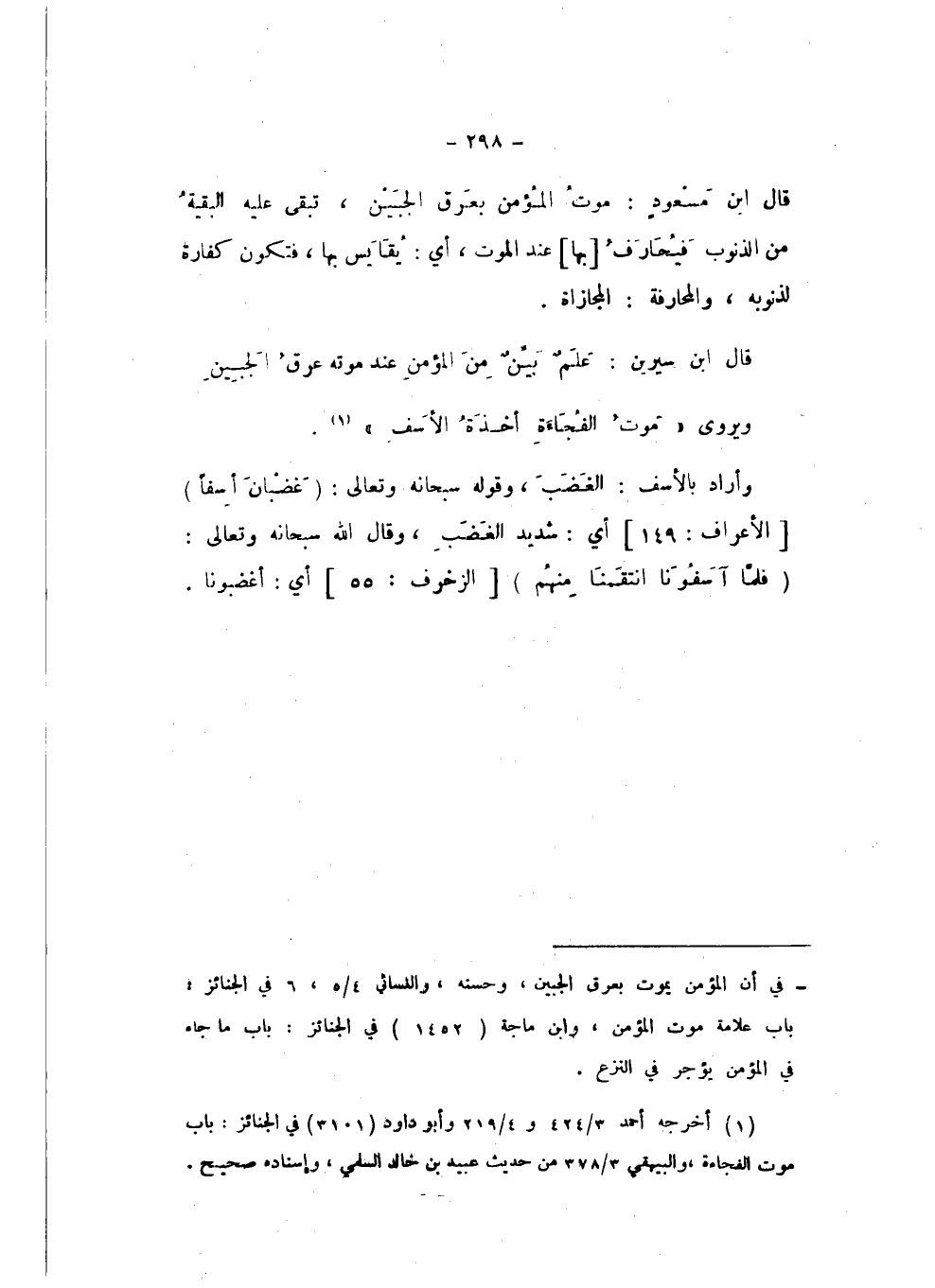 قَالَ ابْنُ مَسْعُودٍ: مَوْتُ الْمُؤْمِنِ بِعَرَقِ الْجَبِينِ، تَبْقَى عَلَيْهِ الْبَقِيَّةُ مِنَ الذُّنُوبِ، فَيُحَارَفُ بِهَا عِنْدَ الْمَوْتِ، أَيْ: يُقَايَسُ بِهَا، فَتَكُونُ كَفَّارَةً لِذُنُوبِهِ، وَالْمُحَارَفَةُ: الْمُجَازَاةُ.