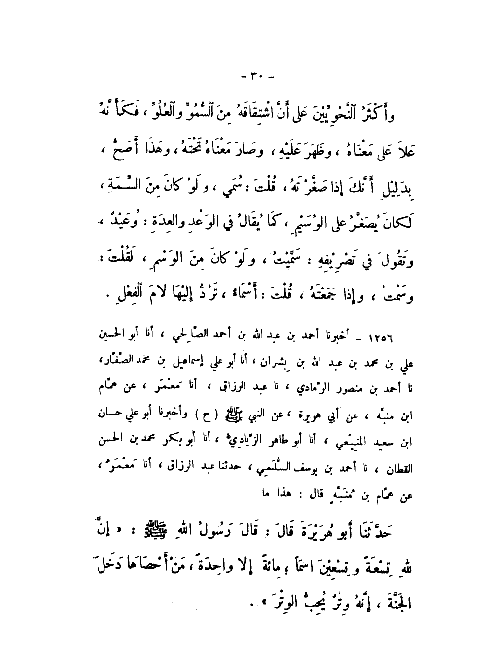 ح وَأَخْبَرَنَا أَبُو عَلِيٍّ حَسَّانُ بْنُ سَعِيدٍ الْمَنِيعِيُّ، أَنا أَبُو طَاهِرٍ الزِّيَادِيُّ، أَنا أَبُو بَكْرٍ مُحَمَّدُ بْنُ الْحَسَنِ الْقَطَّانُ، نَا أَحْمَدُ بْنُ يُوسُفَ السُّلَمِيُّ، حَدَّثَنَا عَبْدُ الرَّزَّاقِ، أَنا مَعْمَرٌ، عَنْ هَمَّامِ بْنِ مُنَبِّهٍ، قَالَ: هَذَا مَا حَدَّثَنَا أَبُو هُرَيْرَةَ، قَالَ: قَالَ رَسُولُ اللَّهِ صَلَّى اللهُ عَلَيْهِ وَسَلَّمَ: «إِنَّ لِلَّهِ تِسْعَةً وَتِسْعِينَ اسْمًا، مِائَةً إِلا وَاحِدَةً، مَنْ أَحْصَاهَا دَخَلَ الْجَنَّةَ، إِنَّهُ وِتْرٌ يُحِبُّ الْوِتْرَ».