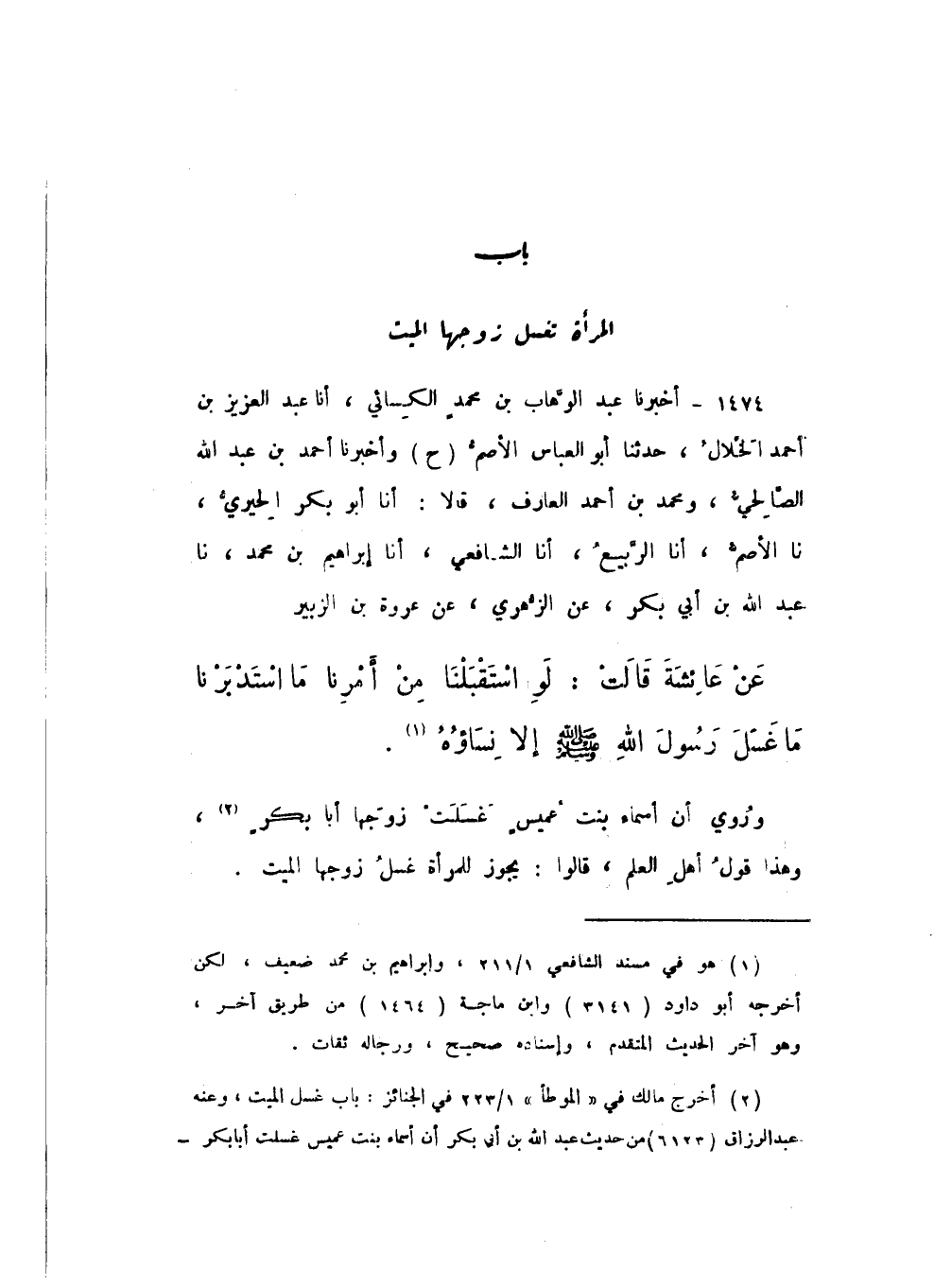 ح وَأَخْبَرَنَا أَحْمَدُ بْنُ عَبْدِ اللَّهِ الصَّالِحِيُّ، وَمُحَمَّدُ بْنُ أَحْمَدَ الْعَارِفُ، قَالا: أَنا أَبُو بَكْرٍ الْحِيرِيُّ، نَا الأَصَمُّ، أَنا الرَّبِيعُ، أَنا الشَّافِعِيُّ، أَنا إِبْرَاهِيمُ بْنُ مُحَمَّدٍ، نَا عَبْدُ اللَّهِ بْنُ أَبِي بَكْرٍ، عَنِ الزُّهْرِيِّ، عَنْ عُرْوَةَ بْنِ الزُّبَيْرِ، عَنْ عَائِشَةَ، قَالَتْ: «لَوِ اسْتَقْبَلْنَا مِنْ أَمْرِنَا مَا اسْتَدْبَرْنَا مَا غَسَلَ رَسُولَ اللَّهِ صَلَّى اللهُ عَلَيْهِ وَسَلَّمَ إِلا نِسَاؤُهُ»