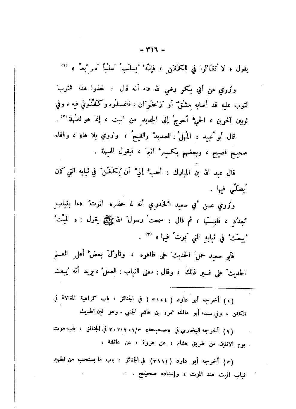 وَرُوِيَ عَنْ أَبِي بَكْرٍ رَضِيَ اللَّهُ عَنْهُ، أَنَّهُ قَالَ: «خُذُوا هَذَا الثَّوْبَ، لِثَوْبٍ عَلَيْهِ قَدْ أَصَابَهُ مِشْقٌ أَوْ زَعْفَرَانٌ، فَاغْسِلُوهُ وَكَفِّنُونِي فِيهِ، وَفِي ثَوْبَيْنِ آخَرَيْنِ، الْحَيُّ أَحْوَجُ إِلَى الْجَدِيدِ مِنَ الْمَيِّتِ، إِنَّمَا هُوَ لِلْمُهْلَةِ».