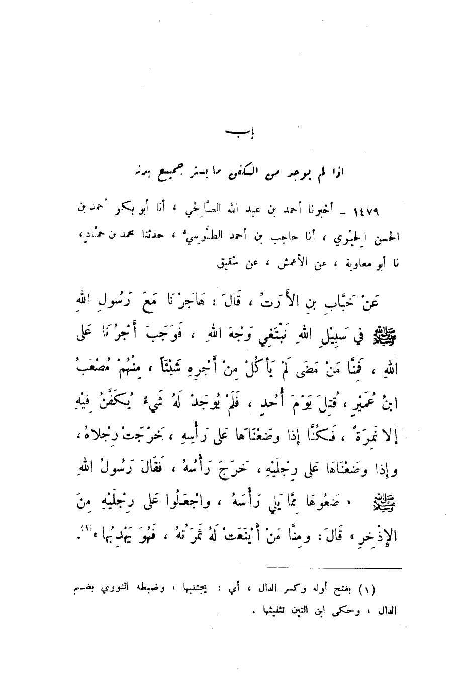 1479 - أَخْبَرَنَا أَحْمَدُ بْنُ عَبْدِ اللَّهِ الصَّالِحِيُّ، أَنا أَبُو بَكْرٍ أَحْمَدُ بْنُ الْحَسَنِ الْحِيرِيُّ، أَنا حَاجِبُ بْنُ أَحْمَدَ الطُّوسِيُّ، حَدَّثَنَا مُحَمَّدُ بْنُ حَمَّادٍ، نَا أَبُو مُعَاوِيَةَ، عَنِ الأَعْمَشِ، عَنْ شَقِيقٍ، عَنْ خَبَّابِ بْنِ الأَرَتِّ، قَالَ: هَاجَرْنَا مَعَ رَسُولِ اللَّهِ صَلَّى اللهُ عَلَيْهِ وَسَلَّمَ فِي سَبِيلِ اللَّهِ، نَبْتَغِي وَجْهَ اللَّهِ، فَوَجَبَ أَجْرُنَا عَلَى اللَّهِ، فَمِنَّا مَنْ مَضَى لَمْ يَأْكُلْ مِنْ أَجْرِهِ شَيْئًا، مِنْهُمْ مُصْعَبُ بْنُ عُمَيْرٍ، قُتِلَ يَوْمَ أُحُدٍ، فَلَمْ يُوجَدْ لَهُ شَيْءٌ يُكَفَّنُ فِيهِ إِلا نَمِرَةٌ، فَكُنَّا إِذَا وَضَعْنَاهَا عَلَى رَأْسِهِ، خَرَجَتْ رِجَلاهُ، وَإِذَا وَضَعْنَاهَا عَلَى رِجْلَيْهِ، خَرَجَ رَأْسُهُ، فَقَالَ رَسُولُ اللَّهِ صَلَّى اللهُ عَلَيْهِ وَسَلَّمَ: «ضَعُوهَا مِمَّا يَلِي رَأْسَهُ، وَاجْعَلُوا عَلَى رِجْلَيْهِ مِنَ الإِذْخِرِ»، قَالَ: وَمِنَّا مَنْ أَيْنَعَتْ لَهُ ثَمَرَتُهُ، فَهُوَ يَهْدِبُهَا.
