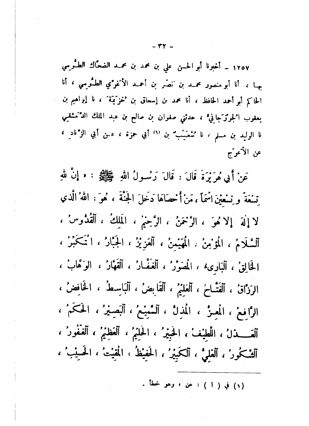 1257 - أَخْبَرَنَا أَبُو الْحَسَنِ عَلِيُّ بْنُ مُحَمَّدِ بْنِ مُحَمَّدٍ الضَّحَّاكُ الطُّوسِيُّ بِهَا، أَنا أَبُو مَنْصُورٍ مُحَمَّدُ بْنُ نَصْرِ بْنِ أَحْمَدَ الأَغَرِّيُّ الطُّوسِيُّ، أَنا الْحَاكِمُ أَبُو أَحْمَدَ الْحَافِظُ، أَنا مُحَمَّدُ بْنُ إِسْحَاقَ بْنِ خُزَيْمَةَ، نَا إِبْرَاهِيمُ بْنُ يَعْقُوبَ الْجُوزَجَانِيُّ، حَدَّثَنِي صَفْوَانُ بْنُ صَالِحِ بْنِ عَبْدِ الْمَلِكِ الدِّمَشْقِيُّ، نَا الْوَلِيدُ بْنُ مُسْلِمٍ، نَا شُعَيْبُ بْنُ أَبِي حَمْزَةَ، عَنْ أَبِي الزِّنَادِ، عَنِ الأَعْرَجِ، عَنْ أَبِي هُرَيْرَةَ، قَالَ: قَالَ رَسُولُ اللَّهِ صَلَّى اللهُ عَلَيْهِ وَسَلَّمَ: " إِنَّ لِلَّهِ تِسْعَةً وَتِسْعِينَ اسْمًا، مَنْ أَحْصَاهَا دَخَلَ الْجَنَّةَ، هُوَ: اللَّهُ الَّذِي لَا إِلَهَ إِلا هُوَ، الرَّحْمَنُ، الرَّحِيمُ، الْمَلِكُ، الْقُدُّوسُ، السَّلامُ، الْمُؤْمِنُ، الْمُهَيْمِنُ، الْعَزِيزُ، الْجَبَّارُ، الْمُتَكَبِّرُ، الْخَالِقُ، الْبَارِئُ، الْمُصَوِّرُ، الْغَفَّارُ، الْقَهَّارُ، الْوَهَّابُ، الرَّزَّاقُ، الْفَتَّاحُ، الْعَلِيمُ، الْقَابِضُ، الْبَاسِطُ، الْخَافِضُ، الرَّافِعُ، الْمُعِزُّ، الْمُذِلُّ، السَّمِيعُ، الْبَصِيرُ، الْحَكَمُ، الْعَدْلُ، اللَّطِيفُ، الْخَبِيرُ، الْحَلِيمُ، الْعَظِيمُ، الْغَفُورُ، الشَّكُورُ، الْعَلِيُّ، الْكَبِيرُ، الْحَفِيظُ، الْمُقِيتُ، الْحَسِيبُ،