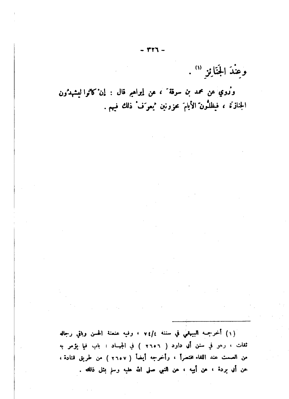 وَعِنْدَ الْجَنَائِزِ» وَرُوِيَ عَنْ مُحَمَّدِ بْنِ سُوقَةَ، عَنْ إِبْرَاهِيمَ، قَالَ: إِنْ كَانُوا لَيَشْهَدُونَ الْجِنَازَةَ، فَيَظَلُّونَ الأَيَّامَ مَحْزُونِينَ يُعْرَفُ ذَلِكَ فِيهِمْ.