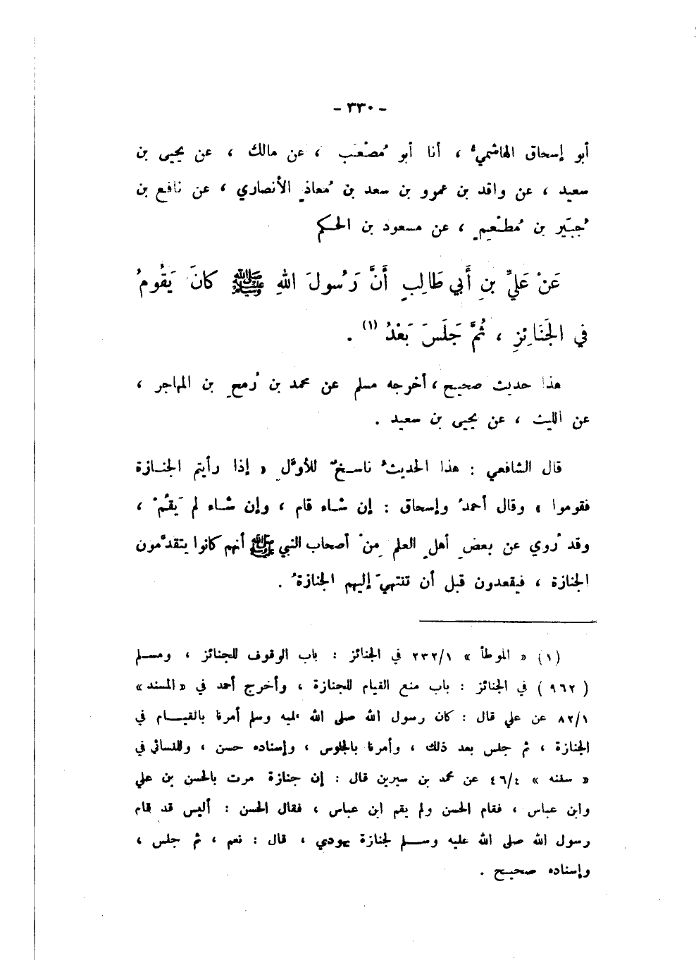 أَبُو إِسْحَاقَ الْهَاشِمِيُّ، أَنا أَبُو مُصْعَبٍ، عَنْ مَالِكٍ، عَنْ يَحْيَى بْنِ سَعِيدٍ، عَنْ وَاقِدِ بْنِ عَمْرِو بْنِ سَعْدِ بْنِ مُعَاذٍ الأَنْصَارِيِّ، عَنْ نَافِعِ بْنِ جُبَيْرِ بْنِ مُطْعِمٍ، عَنْ مَسْعُودِ بْنِ الْحَكَمِ، عَنْ عَلِيِّ بْنِ أَبِي طَالِبٍ، أَنّ رَسُولَ اللَّهِ صَلَّى اللهُ عَلَيْهِ وَسَلَّمَ «كَانَ يَقُومُ فِي الْجَنَائِزِ، ثُمَّ جَلَسَ بَعْدُ».