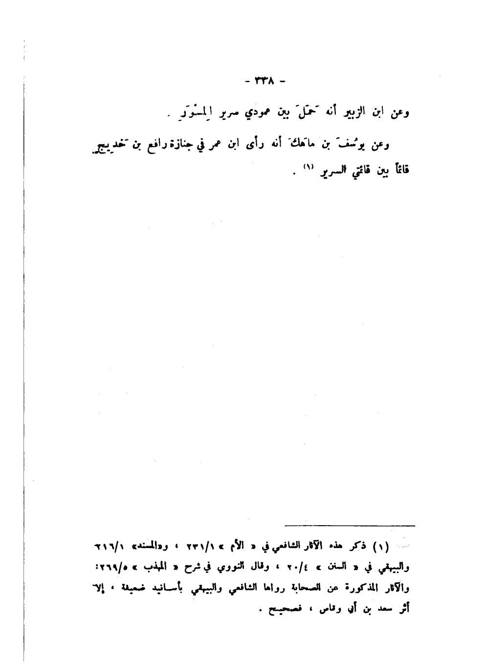 وَعَنْ يُوسُفَ بْنِ مَاهَكَ، أَنَّهُ رَأَى ابْنَ عُمَرَ فِي جِنَازَةِ رَافِعِ بْنِ خَدِيجٍ، قَائِمًا بَيْنَ قَائِمَتَيِ السَّرِيرِ