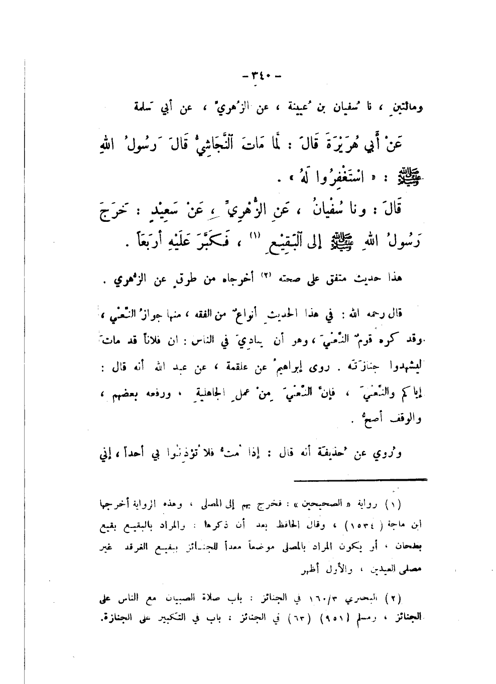 قَالَ رَحِمَهُ اللَّهُ: فِي هَذَا الْحَدِيثِ أَنْوَاعٌ مِنَ الْفِقْهِ، مِنْهَا جَوَازُ النَّعْيِ، وَقَدْ كَرِهَ قَوْمٌ النَّعْيَ، وَهُوَ أَنْ يُنَادِيَ فِي النَّاسِ، أَنَّ فُلانًا قَدْ مَاتَ، لِيَشْهَدُوا جِنَازَتَهُ.