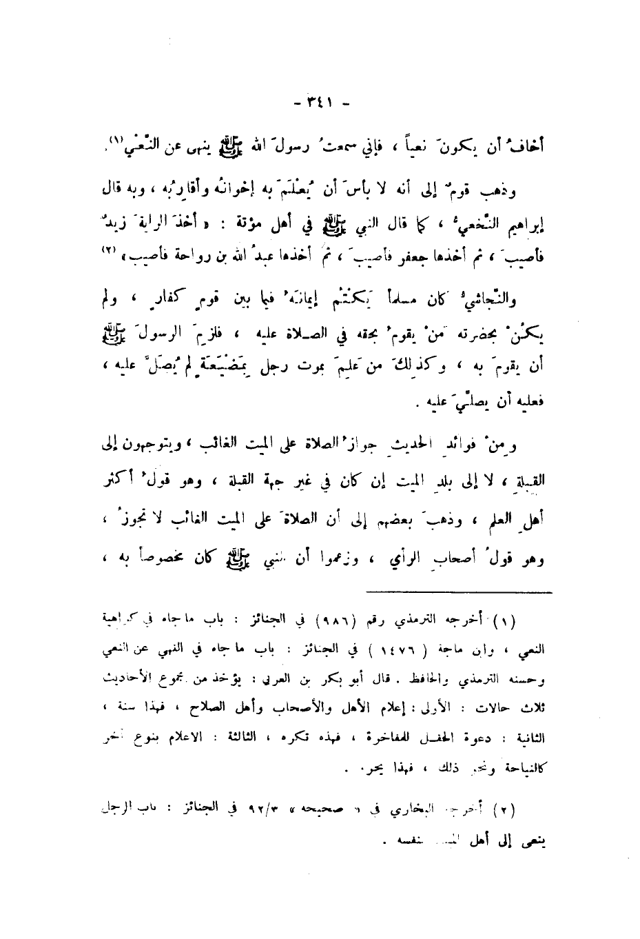 وَالنَّجَاشِيُّ كَانَ مُسْلِمًا يَكْتُمُ إِيمَانَهُ فِيمَا بَيْنَ قَوْمٍ كُفَّارٍ، وَلَمْ يكُنْ بِحَضْرَةِ مَنْ يَقُومُ بِحَقِّهِ فِي الصَّلاةِ عَلَيْهِ، فَلَزِمَ الرَّسُولَ صَلَّى اللهُ عَلَيْهِ وَسَلَّمَ أَنْ يَقُومَ بِهِ، وَكَذَلِكَ مَنْ عَلِمَ بِمَوْتِ رَجُلٍ بِمَضْيَعَةٍ، لَمْ يُصَلَّ عَلَيْهِ، فَعَلَيْهِ أَنْ يُصَلِّيَ عَلَيْهِ.