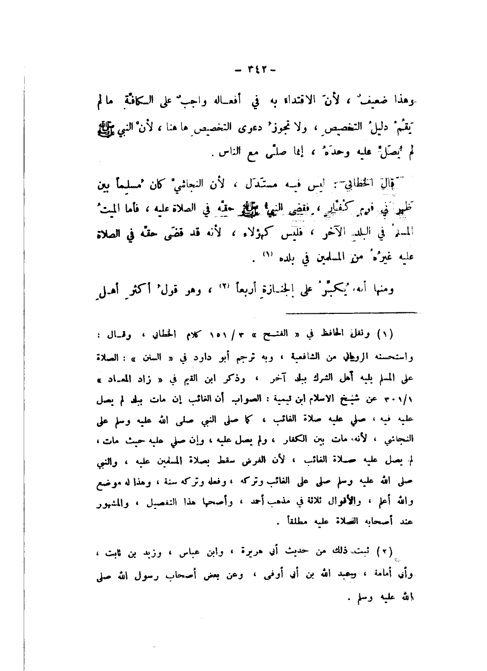 قَالَ الْخَطَّابِيُّ: لَيْسَ فِيهِ مُسْتَدَلٌّ، لأَنَّ النَّجَاشِيَّ كَانَ مُسْلِمًا بَيْنَ ظَهْرَانِيِّ قَوْمٍ كُفَّارٍ، فَقَضَى النَّبِيُّ صَلَّى اللهُ عَلَيْهِ وَسَلَّمَ حَقَّهُ فِي الصَّلاةِ عَلَيْهِ، فَأَمَّا الْمَيِّتُ الْمُسْلِمُ فِي الْبَلَدِ الآخَرِ، فَلَيْسَ كَهَؤُلاءِ، لأَنَّهُ قَدْ قَضَى حَقَّهُ فِي الصَّلاةِ عَلَيْهِ غَيْرُهُ مِنَ الْمُسْلِمِينَ فِي بَلَدِهِ.