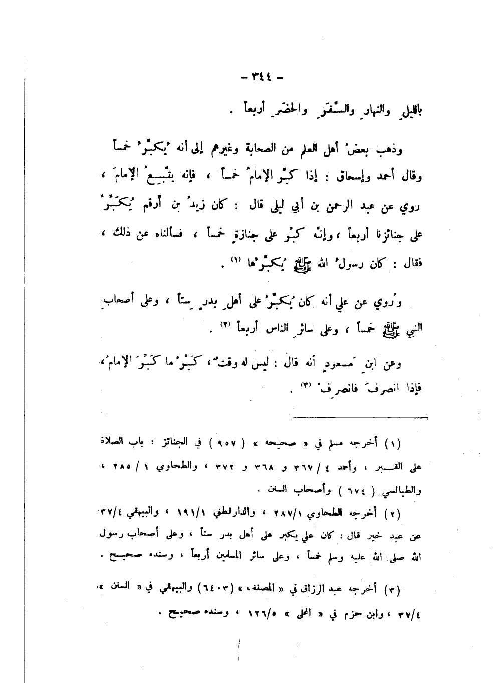 رُوِيَ عَنْ عَبْدِ الرَّحْمَنِ بْنِ أَبِي لَيْلَى، قَالَ: كَانَ زَيْدُ بْنُ أَرْقَمَ يُكَبِّرُ عَلَى جَنَائِزِنَا أَرْبَعًا، وَإِنَّهُ كَبَّرَ عَلَى جِنَازَةٍ خَمْسًا، فَسَأَلْنَاهُ عَنْ ذَلِكَ، فَقَالَ: كَانَ رَسُولُ اللَّهِ صَلَّى اللهُ عَلَيْهِ وَسَلَّمَ يُكَبِّرُهَا.
