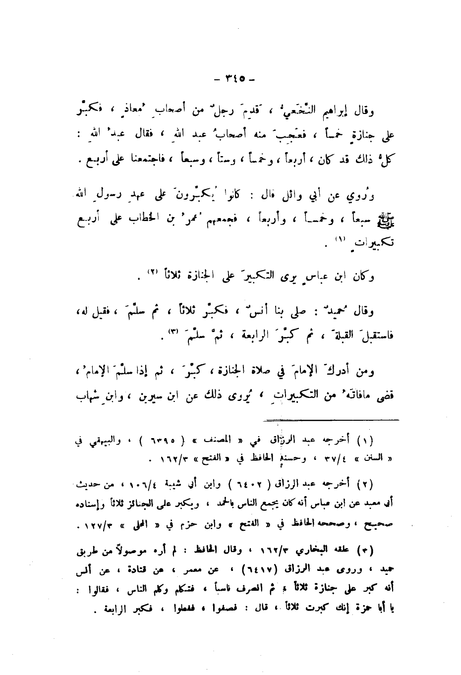 وَقَالَ إِبْرَاهِيمُ النَّخَعِيُّ: قَدِمَ رَجُلٌ مِنْ أَصْحَابِ مُعَاذٍ، فَكَبَّرَ عَلَى جِنَازَةٍ خَمْسًا، فعَجِبَ مِنْهُ أَصْحَابُ عَبْدِ اللَّهِ، فَقَالَ عَبْدُ اللَّهِ: كُلُّ ذَلِكَ قَدْ كَانَ، أَرْبَعًا، وَخَمْسًا، وَسِتًّا، وَسَبْعًا.