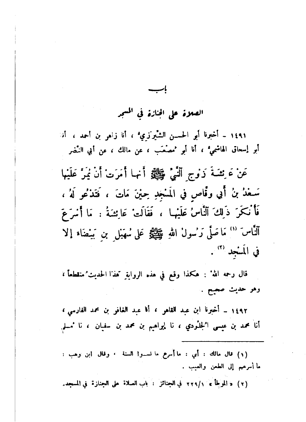 1491 - أَخْبَرَنَا أَبُو الْحَسَنِ الشِّيرَزِيُّ، أَنا زَاهِرُ بْنُ أَحْمَدَ، أَنا أَبُو إِسْحَاقُ الْهَاشِمِيُّ، أَنا أَبُو مُصْعَبٍ، عَنْ مَالِكٍ، عَنْ أَبِي النَّضْرِ، عَنْ عَائِشَةَ، زَوْجِ النَّبِيِّ صَلَّى اللهُ عَلَيْهِ وَسَلَّمَ أَنَّهَا أَمَرَتْ أَنْ يُمَرَّ عَلَيْهَا سَعْدُ بْنُ أَبِي وَقَّاصٍ فِي الْمَسْجِدِ حِينَ مَاتَ، فَتَدْعُو لَهُ، فَأَنْكَرَ ذَلِكَ النَّاسُ عَلَيْهَا، فَقَالَتْ عَائِشَةَ: «مَا أَسْرَعَ النَّاسَ! مَا صَلَّى رَسُولُ اللَّهِ صَلَّى اللهُ عَلَيْهِ وَسَلَّمَ عَلَى سُهَيْلِ ابْنِ بَيْضَاءَ، إِلا فِي الْمَسْجِدِ».