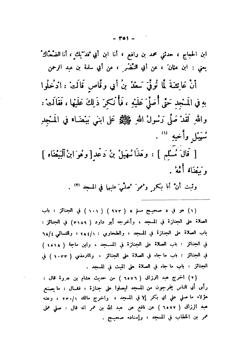 بْنُ الْحَجَّاجِ، حَدَّثَنِي مُحَمَّدُ بْنُ رَافِعٍ، أَنا ابْنُ أَبِي فُدَيْكٍ، أَنا الضَّحَّاكُ، يَعْنِي ابْنَ عُثْمَانَ، عَنْ أَبِي النَّضْرِ، عَنْ أَبِي سَلَمَةَ بْنِ عَبْدِ الرَّحْمَنِ، أَنَّ عَائِشَةَ لَمَّا تُوُفِّيَ سَعْدُ بْنُ أَبِي وَقَّاصٍ، قَالَتْ: " ادْخُلُوا بِهِ فِي الْمَسْجِدِ حَتَّى أُصَلِّيَ عَلَيْهِ.