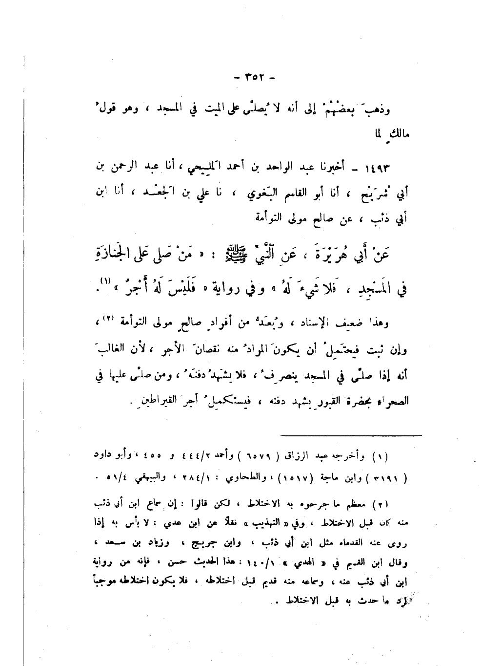 وَهَذَا ضَعِيفُ الإِسْنَادِ، وَيُعَدُّ مِنْ أَفْرَادِ صَالِحٍ مَوْلَى التَّوْءَمَةِ، وَإِنْ ثَبَتَ فَيَحْتَمِلُ أَنْ يَكُونَ الْمُرَادُ مِنْهُ نُقْصَانَ الأَجْرِ، لأَنَّ الْغَالِبَ أَنَّهُ إِذَا صَلَّى فِي الْمَسْجِدِ يَنْصَرِفُ، فَلا يَشْهَدُ دَفْنَهُ، وَمَنْ صَلَّى عَلَيْهَا فِي الصَّحَرَاءِ بِحَضْرَةِ الْقُبُورِ يَشْهَدُ دَفْنَهُ، فَيَسْتَكْمِلُ أَجْرَ الْقِيرَاطَيْنِ.