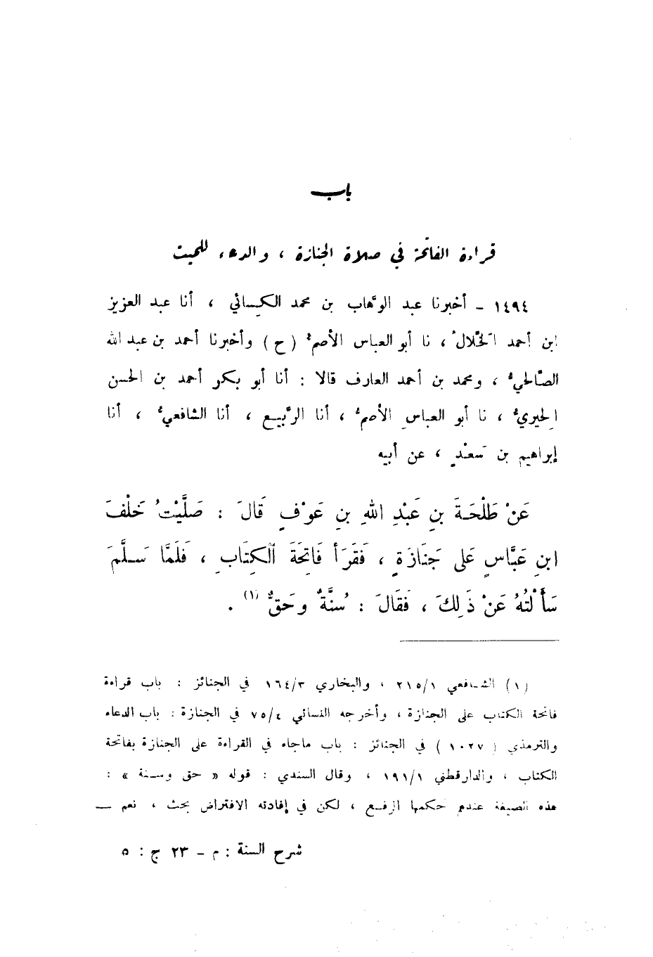 ح وَأَخْبَرَنَا أَحْمَدُ بْنُ عَبْدِ اللَّهِ الصَّالِحِيُّ، وَمُحَمَّدُ بْنُ أَحْمَدَ الْعَارِفُ، قَالا: أَنا أَبُو بَكْرٍ أَحْمَدُ بْنُ الْحَسَنِ الْحِيرِيُّ، نَا أَبُو الْعَبَّاسِ الأَصَمُّ، أَنا الرَّبِيعُ، أَنا الشَّافِعِيُّ، أَنا إِبْرَاهِيمُ بْنُ سَعْدٍ، عَنْ أَبِيهِ، عَنْ طَلْحَةَ بْنِ عَبْدِ اللَّهِ بْنِ عَوْفٍ، قَالَ: صَلَّيْتُ خَلْفَ ابْنِ عَبَّاسٍ عَلَى جِنَازَةٍ، فَقَرَأَ فَاتِحَةَ الْكِتَابِ، فَلَمَّا سَلَّمَ سَأَلْتُهُ عَنْ ذَلِكَ، فَقَالَ: «سُنَّةٌ وَحَقٌّ».