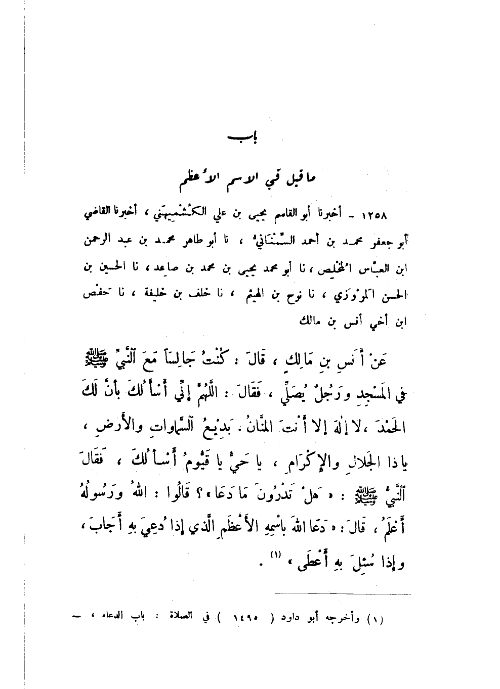 1258 - أَخْبَرَنَا أَبُو الْقَاسِمِ يَحْيَى بْنُ عَلِيٍّ الْكُشْمِيهَنِيُّ، أَخْبَرَنَا الْقَاضِي أَبُو جَعْفَرٍ مُحَمَّدُ بْنُ أَحْمَدَ السِّمْنَانِيُّ، نَا أَبُو طَاهِرٍ مُحَمَّدُ بْنُ عَبْدِ الرَّحْمَنِ بْنِ الْعَبَّاسِ الْمُخْلِصُ، نَا أَبُو مُحَمَّدٍ يَحْيَى بْنُ مُحَمَّدِ بْنِ صَاعِدٍ، نَا الْحُسَيْنُ بْنُ الْحَسَنِ الْمَرْوَزِيُّ، نَا نُوحُ بْنُ الْهَيْثَمِ، نَا خَلَفُ بْنُ خَلِيفَةَ، نَا حَفْصُ ابْنُ أَخِي أَنَسِ بْنِ مَالِكٍ، عَنْ أَنَسِ بْنِ مَالِكٍ، قَالَ: كُنْتُ جَالِسًا مَعَ النَّبِيِّ صَلَّى اللهُ عَلَيْهِ وَسَلَّمَ فِي الْمَسْجِدِ، وَرَجُلٌ يُصَلِّي، فَقَالَ: اللَّهُمَّ إِنِّي أَسْأَلُكَ بِأَنَّ لَكَ الْحَمْدَ، لَا إِلَهَ إِلا أَنْتَ الْمَنَّانُ، بَدِيعُ السَّمَوَاتِ وَالأَرْضِ، يَا ذَا الْجَلالِ وَالإِكْرَامِ، يَا حَيُّ يَا قَيُّومُ أَسْأَلُكَ، فَقَالَ النَّبِيُّ صَلَّى اللهُ عَلَيْهِ وَسَلَّمَ: هَلْ تَدْرُونَ مَا دَعَا؟ قَالُوا: اللَّهُ وَرَسُولُهُ أَعْلَمُ، قَالَ: «دَعَا اللَّهَ بِاسْمِهِ الأَعْظَمِ الَّذِي إِذَا دُعِيَ بِهِ أَجَابَ، وَإِذَا سُئِلَ بِهِ أَعْطَى»