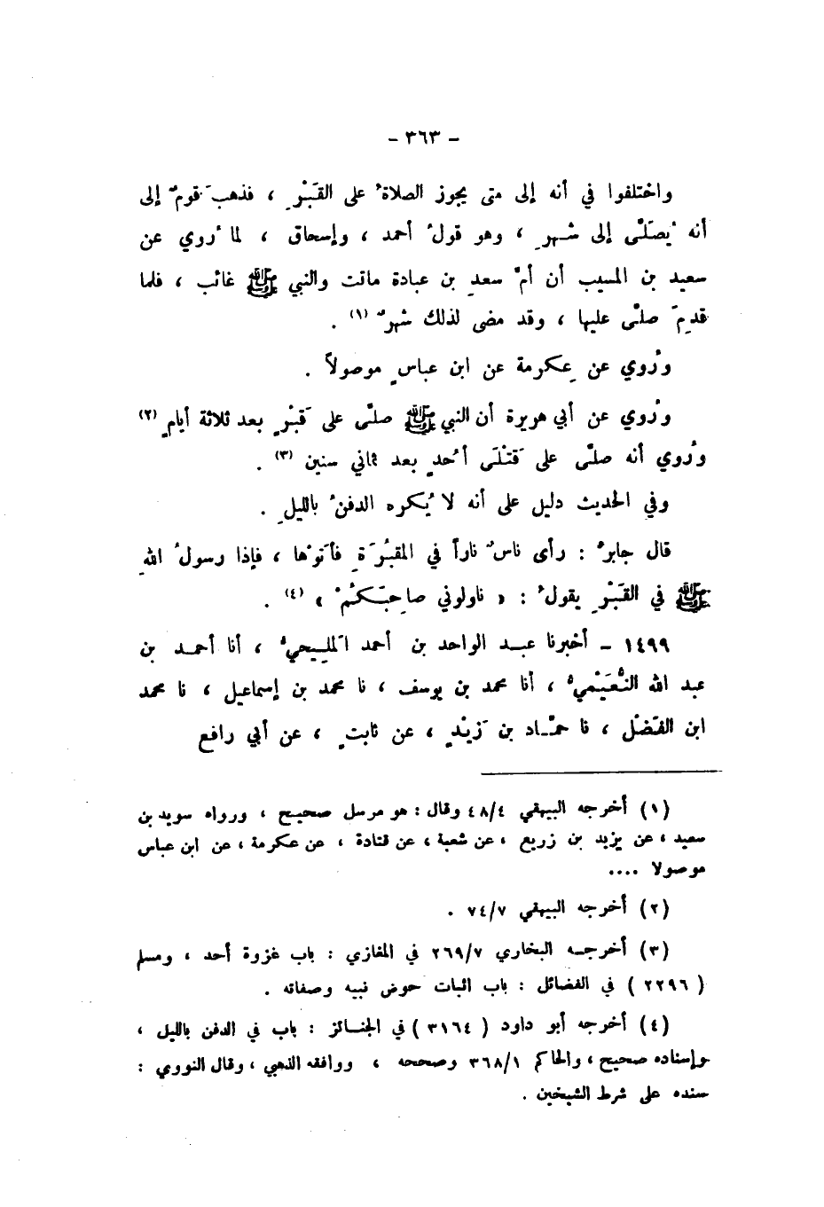 وَرُوِيَ أَنَّهُ صَلَّى عَلَى قَتْلَى أُحُدٍ بَعْدَ ثَمَانِي سِنِينَ».