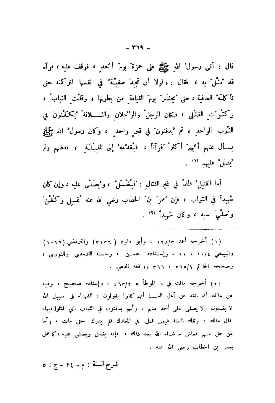 وَقَلَّتِ الثِّيَابُ، وَكَثُرَتِ الْقَتْلَى، فَكَانَ الرَّجُلُ وَالرَّجُلانِ وَالثَّلاثَةُ يُكَفَّنُونَ فِي الثَّوْبِ الْوَاحِدِ، ثُمَّ يُدْفَنُونَ فِي قَبْرٍ وَاحِدٍ، وَكَانَ رَسُولُ اللَّهِ صَلَّى اللهُ عَلَيْهِ وَسَلَّمَ يَسْأَلُ عَنْهُمْ أَيُّهُمْ أَكْثَرُ قُرْآنًا، فَيُقَدِّمُهُ إِلَى الْقِبْلَةِ، فَدَفَنَهُمْ، وَلَمْ يُصَلَّ عَلَيْهِمْ.