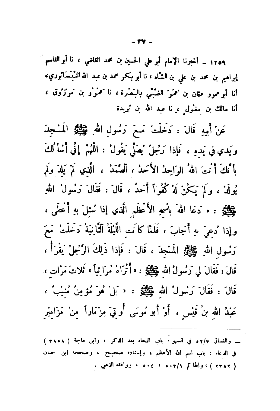 1259 - أَخْبَرَنَا الإِمَامُ أَبُو عَلِيٍّ الْحُسَيْنُ بْنُ مُحَمَّدٍ الْقَاضِي، نَا أَبُو الْقَاسِمِ إِبْرَاهِيمُ بْنُ مُحَمَّدِ بْنِ عَلِيِّ بْنِ الشَّاهِ، نَا أَبُو بَكْرٍ مُحَمَّدُ بْنُ عَبْدِ اللَّهِ النَّيْسَابُورِيُّ، أَنا أَبُو عَمْرٍو عُثْمَانُ بْنُ عُمَرَ الضَّبِّيُّ بِالْبَصْرَةِ، نَا عَمْرُو بْنُ مَرْزُوقٍ، أَنا مَالِكُ بْنُ مِغْوَلٍ، نَا عَبْدُ اللَّهِ بْنُ بُرَيْدَةَ، عَنْ أَبِيهِ، قَالَ: دَخَلْتُ مَعَ رَسُولِ اللَّهِ صَلَّى اللهُ عَلَيْهِ وَسَلَّمَ الْمَسْجِدَ، وَيَدِي فِي يَدِهِ، فَإِذَا رَجُلٌ يُصَلِّي، يَقُولُ: اللَّهُمَّ إِنِّي أَسْأَلُكَ بِأَنَّكَ أَنْتَ اللَّهُ الْوَاحِدُ الأَحَدُ، الصَّمَدُ، الَّذِي لَمْ يَلِدْ وَلَمْ يُولَدْ، وَلَمْ يَكُنْ لَهُ كُفُوًا أَحَدٌ، قَالَ: فَقَالَ رَسُولُ اللَّهِ صَلَّى اللهُ عَلَيْهِ وَسَلَّمَ: «دَعَا اللَّهَ بِاسْمِهِ الأَعْظَمِ الَّذِي إِذَا سُئِلَ بِهِ أَعْطَى، وَإِذَا دُعِيَ بِهِ أَجَابَ»، فَلَمَّا كَانَتِ اللَّيْلَةُ الثَّانِيَةُ دَخَلْتُ مَعَ رَسُولِ اللَّهِ صَلَّى اللهُ عَلَيْهِ وَسَلَّمَ الْمَسْجِدَ، قَالَ: فَإِذَا ذَلِكَ الرَّجُلُ يَقْرَأُ، قَالَ: فَقَالَ لِي رَسُولُ اللَّهِ صَلَّى اللهُ عَلَيْهِ وَسَلَّمَ: «أَتُرَاهُ مُرَائِيًا» ثَلاثَ مَرَّاتٍ، قَالَ: فَقَالَ رَسُولُ اللَّهِ صَلَّى اللهُ عَلَيْهِ وَسَلَّمَ: «بَلْ هُوَ مُؤْمِنٌ مُنِيبٌ، عَبْدُ اللَّهِ بْنُ قَيْسٍ، أَوْ أَبُو مُوسَى أُوتِيَ مِزْمَارًا مِنْ مَزَامِيرِ