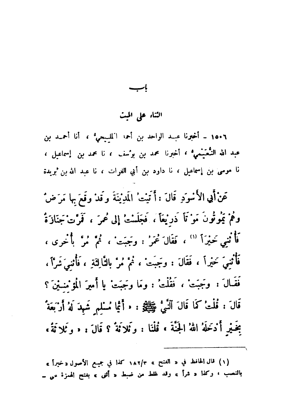 1506 - أَخْبَرَنَا عَبْدُ الْوَاحِدِ بْنُ أَحْمَدَ الْمَلِيحِيُّ، أَنا أَحْمَدُ بْنُ عَبْدِ اللَّهِ النُّعَيْمِيُّ، أَخْبَرَنَا مُحَمَّدُ بْنُ يُوسُفَ، نَا مُحَمَّدُ بْنُ إِسْمَاعِيلَ، نَا مُوسَى بْنُ إِسْمَاعِيلَ، نَا دَاوُدُ بْنُ أَبِي الْفُرَاتِ، نَا عَبْدُ اللَّهِ بْنُ بُرَيْدَةَ، عَنْ أَبِي الأَسْوَدِ، قَالَ: أَتَيْتُ الْمَدِينَةَ وَقَدْ وَقَعَ بِها مَرَضٌ، وَهُمْ يَمُوتُونَ مَوْتًا ذَرِيعًا، فَجَلَسْتُ إِلَى عُمَرَ، فَمَرَّتْ جِنَازَةٌ فَأُثْنِيَ خَيْرًا، فَقَالَ عُمَرُ: وَجَبَتْ، ثُمَّ مُرَّ بِأُخْرَى، فَأُثْنِيَ خَيْرًا، فَقَالَ: وَجَبَتْ، ثُمَّ مُرَّ بِالثَّالِثَةِ، فَأُثْنِيَ شَرًّا، فَقَالَ: وَجَبَتْ، فَقُلْتُ: وَمَا وَجَبَتْ يَا أَمِيرَ الْمُؤْمِنِينَ؟ قَالَ: قُلْتُ كمَا قَالَ النَّبِيُّ صَلَّى اللهُ عَلَيْهِ وَسَلَّمَ: «أَيُّمَا مُسْلِمٍ شَهِدَ لَهُ أَرْبَعَةٌ بِخَيْرٍ أَدْخَلَهُ اللَّهُ الْجَنَّةَ»، قُلْنَا: وَثَلاثَةٌ؟ قَالَ: «وَثَلاثَةٌ»