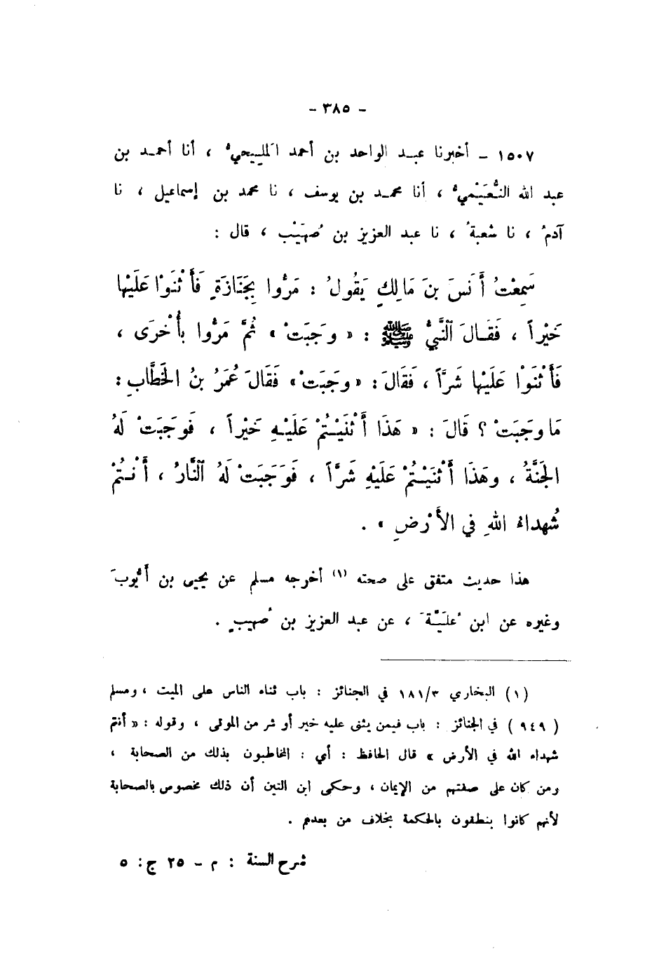 1507 - أَخْبَرَنَا عَبْدُ الْوَاحِدِ بْنُ أَحْمَدَ الْمَلِيحِيُّ، أَنا أَحْمَدُ بْنُ عَبْدِ اللَّهِ النُّعَيْمِيُّ، أَنا مُحَمَّدُ بْنُ يُوسُفَ، نَا مُحَمَّدُ بْنُ إِسْمَاعِيلَ، نَا آدَمُ، نَا شُعْبَةُ، نَا عَبْدُ الْعَزِيزِ بْنُ صُهَيْبٍ، قَالَ: سَمِعْتُ أَنَسَ بْنَ مَالِكٍ، يَقُولُ: مَرُّوا بِجِنَازَةٍ فَأَثْنَوْا عَلَيْهَا خَيْرًا، فَقَالَ النَّبِيُّ صَلَّى اللهُ عَلَيْهِ وَسَلَّمَ: «وَجَبَتْ»، ثُمَّ مَرُّوا بِأُخْرَى، فَأَثْنَوْا عَلَيْهَا شَرًّا، فَقَالَ: «وَجَبَتْ»، فَقَالَ عُمَرُ بْنُ الْخَطَّابِ: مَا وَجَبَتْ؟ قَالَ: «هَذَا أَثْنَيْتُمْ عَلَيْهِ خَيْرًا، فَوَجَبَتْ لَهُ الْجَنَّةُ، وَهَذَا أَثْنَيْتُمْ عَلَيْهِ شَرًّا، فَوَجَبَتْ لَهُ النَّارُ، أَنْتُمْ شُهَدَاءُ اللَّهِ فِي الأَرْضِ».