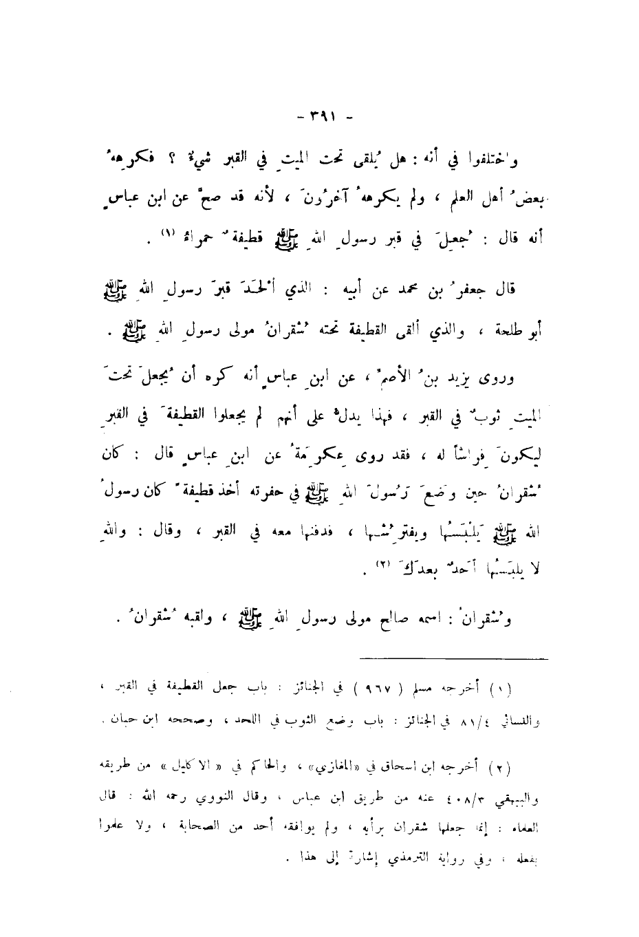وَرَوَى يَزِيدُ بْنُ الأَصَمِّ، عَنِ ابْنِ عَبَّاسٍ، أَنَّهُ كَرِهَ، أَنْ يُجْعَلَ تَحْتَ الْمَيِّتِ ثَوْبٌ فِي الْقَبْرِ، فَهَذَا يَدُلُّ عَلَى أَنَّهُمْ لَمْ يَجْعَلُوا الْقَطِيفَةَ فِي الْقَبْرِ لِيَكُونَ فِرَاشًا لَهُ، فَقَدْ رَوَى عِكْرِمَةُ، عَنِ ابْنِ عَبَّاسٍ، قَالَ: كَانَ شُقْرَانُ حِينَ وُضِعَ رَسُولَ اللَّهِ صَلَّى اللهُ عَلَيْهِ وَسَلَّمَ فِي حُفْرَتِهِ أَخَذَ قَطِيفَةً، كَانَ رَسُولُ اللَّهِ صَلَّى اللهُ عَلَيْهِ وَسَلَّمَ يَلْبَسُهَا، وَيَفْتَرِشُهَا، فَدَفَنَهَا مَعَهُ فِي الْقَبْرِ، وَقَالَ: «وَاللَّهِ لَا يَلْبَسُهَا أَحَدٌ بَعْدَكَ».