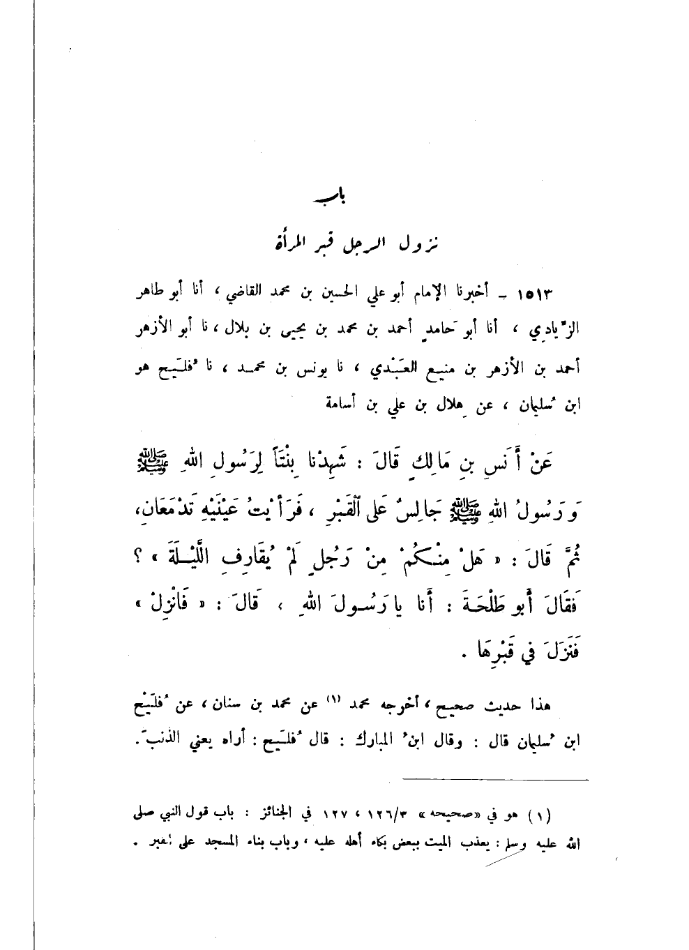 1513 - أَخْبَرَنَا الإِمَامُ أَبُو عَلِيٍّ الْحُسَيْنُ بْنُ مُحَمَّدٍ الْقَاضِي، أَنا أَبُو طَاهِرٍ الزِّيَادِيُّ، أَنا أَبُو حَامِدٍ أَحْمَدُ بْنُ مُحَمَّدِ بْنِ يَحْيَى بْنِ بِلالٍ، نَا أَبُو الأَزْهَرِ أَحْمَدُ بْنُ الأَزْهَرِ بْنِ مَنِيعٍ الْعَبْدِيُّ، نَا يُونُسُ بْنُ مُحَمَّدٍ، نَا فُلَيْحُ هُوَ ابْنُ سُلَيْمَانَ، عَنْ هِلالِ بْنِ عَلِيِّ بْنِ أُسَامَةَ، عَنْ أَنَسِ بْنِ مَالِكٍ، قَالَ: شَهِدْنَا بِنْتًا لِرَسُولِ اللَّهِ صَلَّى اللهُ عَلَيْهِ وَسَلَّمَ، وَرَسُولُ اللَّهِ صَلَّى اللهُ عَلَيْهِ وَسَلَّمَ جَالِسٌ عَلَى الْقَبْرِ، فَرَأيْتُ عَيْنَيْهِ تَدْمَعَانِ، ثُمَّ قَالَ: «هَلْ مِنْكُمْ مِنْ رَجُلٍ لَمْ يُقَارِفِ اللَّيْلَةَ؟» فَقَالَ أَبُو طَلْحَةَ: أَنَا يَا رَسُولَ اللَّهِ، قَالَ: «فَانْزِلْ، فَنَزَلَ فِي قَبْرِهَا».
